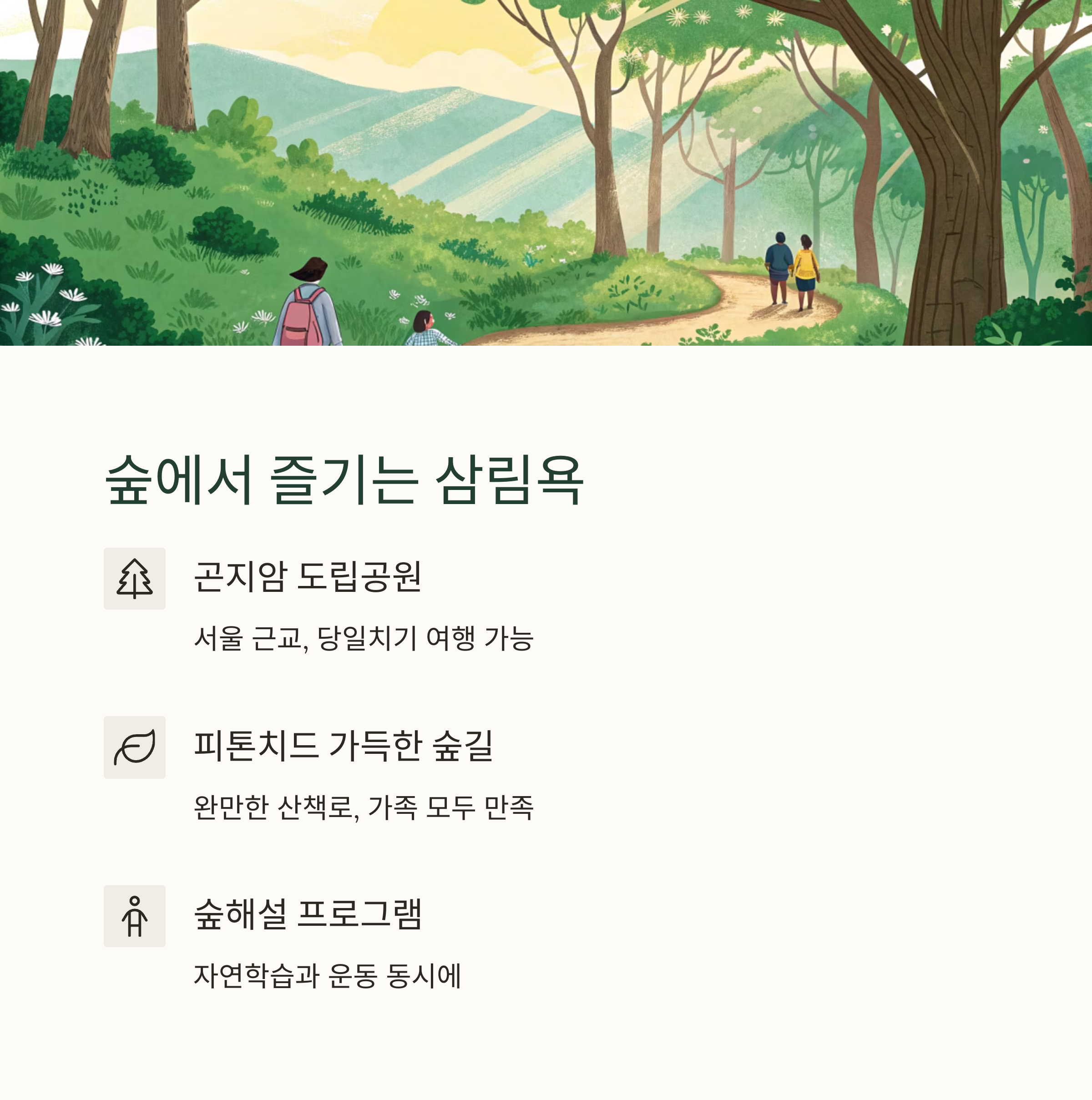 완만한 산책로와 피톤치드 가득한 숲길이 특징입니다.