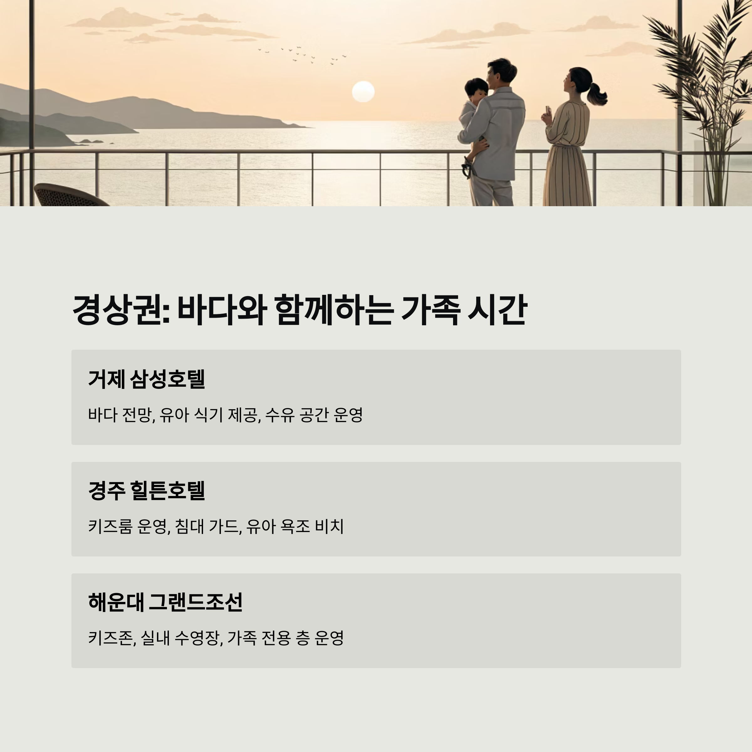 | 경상권 | 경주 힐튼, 거제 삼성호텔 | 바다 인접, 키즈존, 유아 편의 완비 |