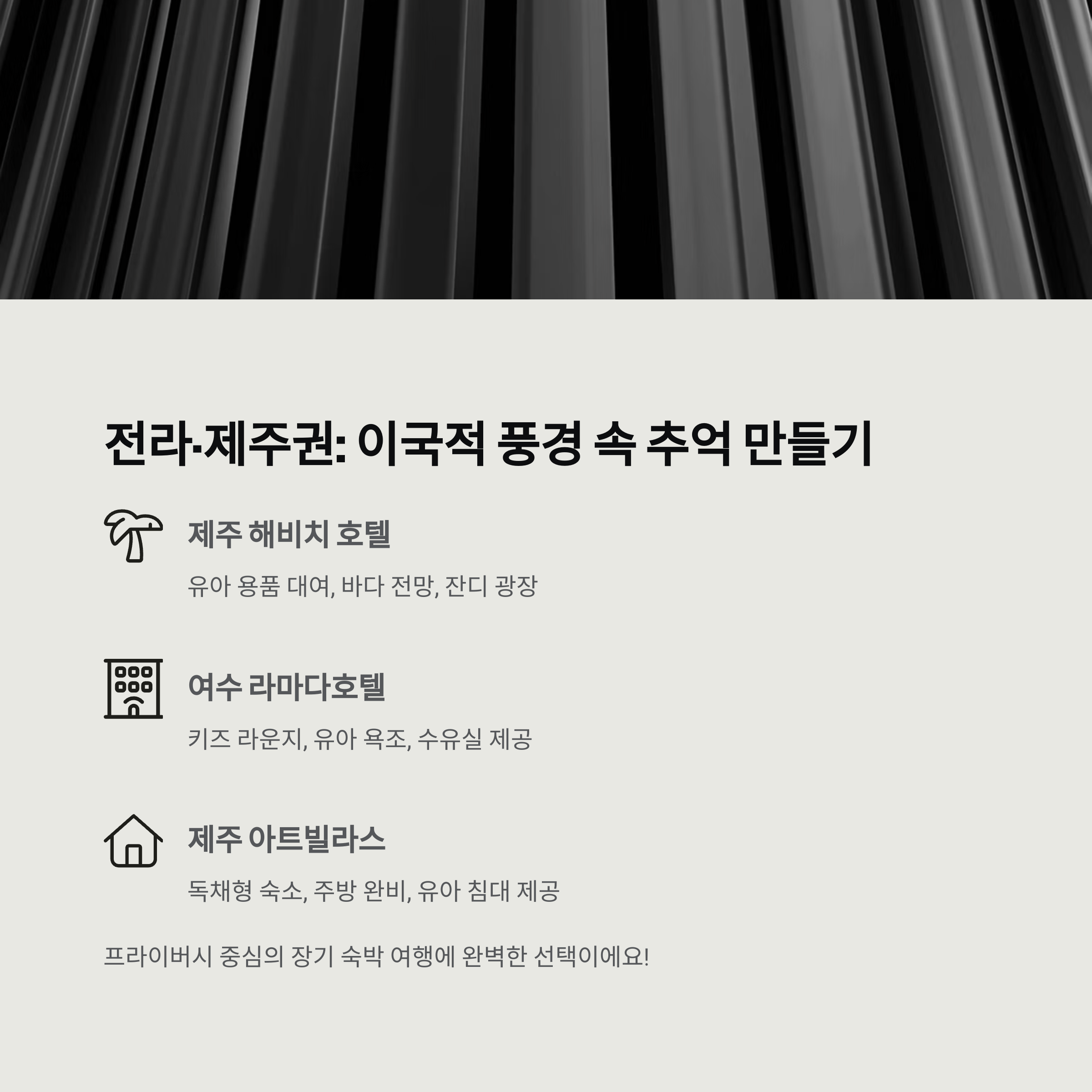 | 전라/제주 | 해비치 호텔, 아트빌라스 | 프라이버시 보장, 유아 용품 제공, 자연 뷰 |