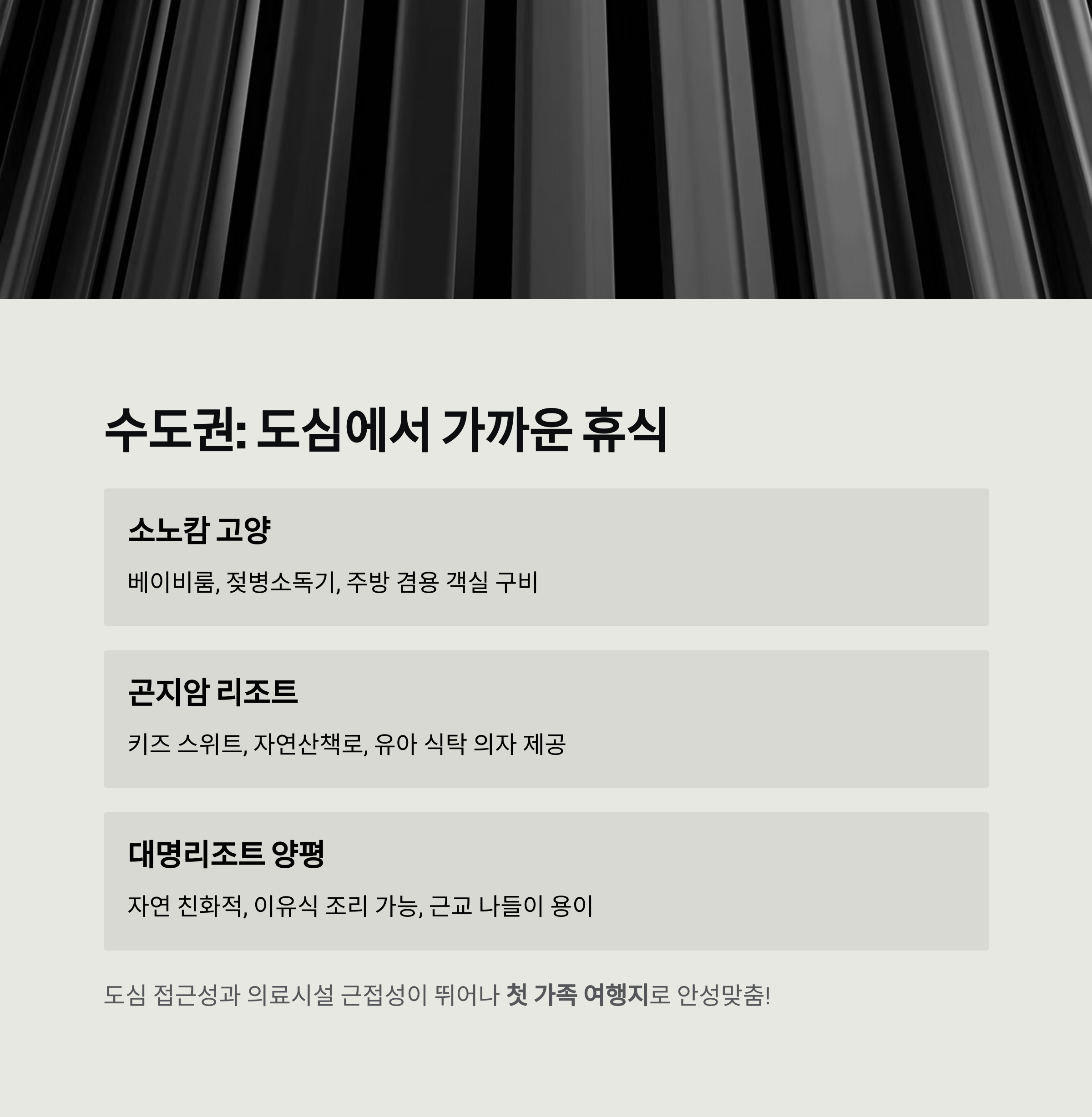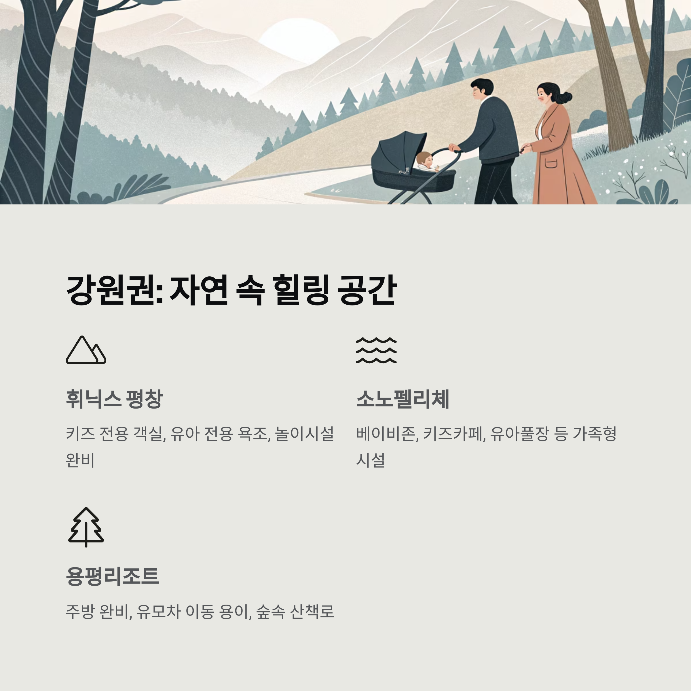 | 수도권 | 곤지암 리조트, 소노캄 고양 | 도심 접근성, 베이비룸, 이유식 준비 용이 |