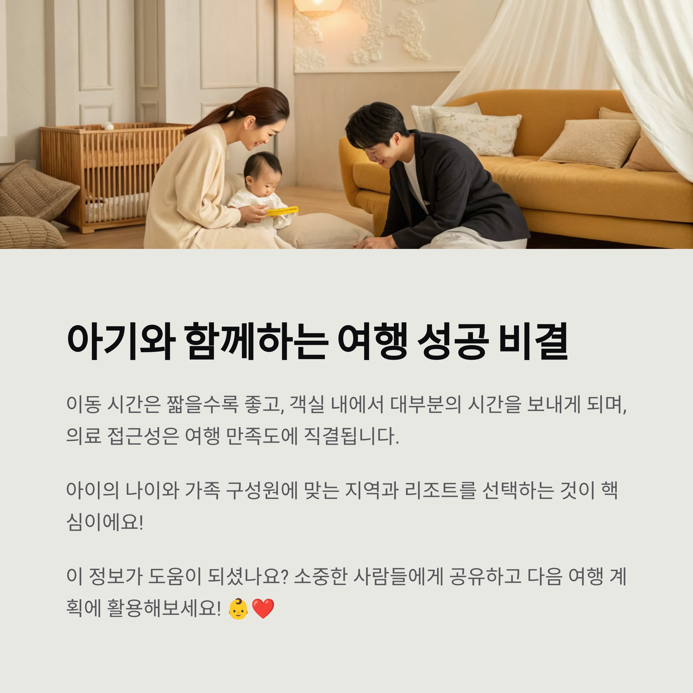 낯선 공간에서 아기의 루틴을 유지하려면 안전하고 편의시설이 완비된 리조트가 필수입니다