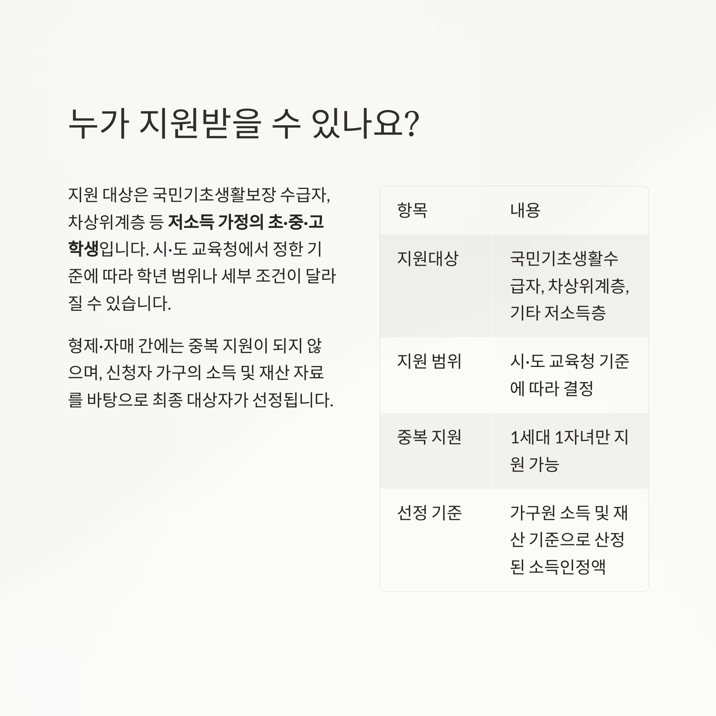형제·자매 간에는 중복 지원이 되지 않으며, 신청자 가구의 소득 및 재산 자료를 바탕으로 최종 대상자가 선정됩니다.
