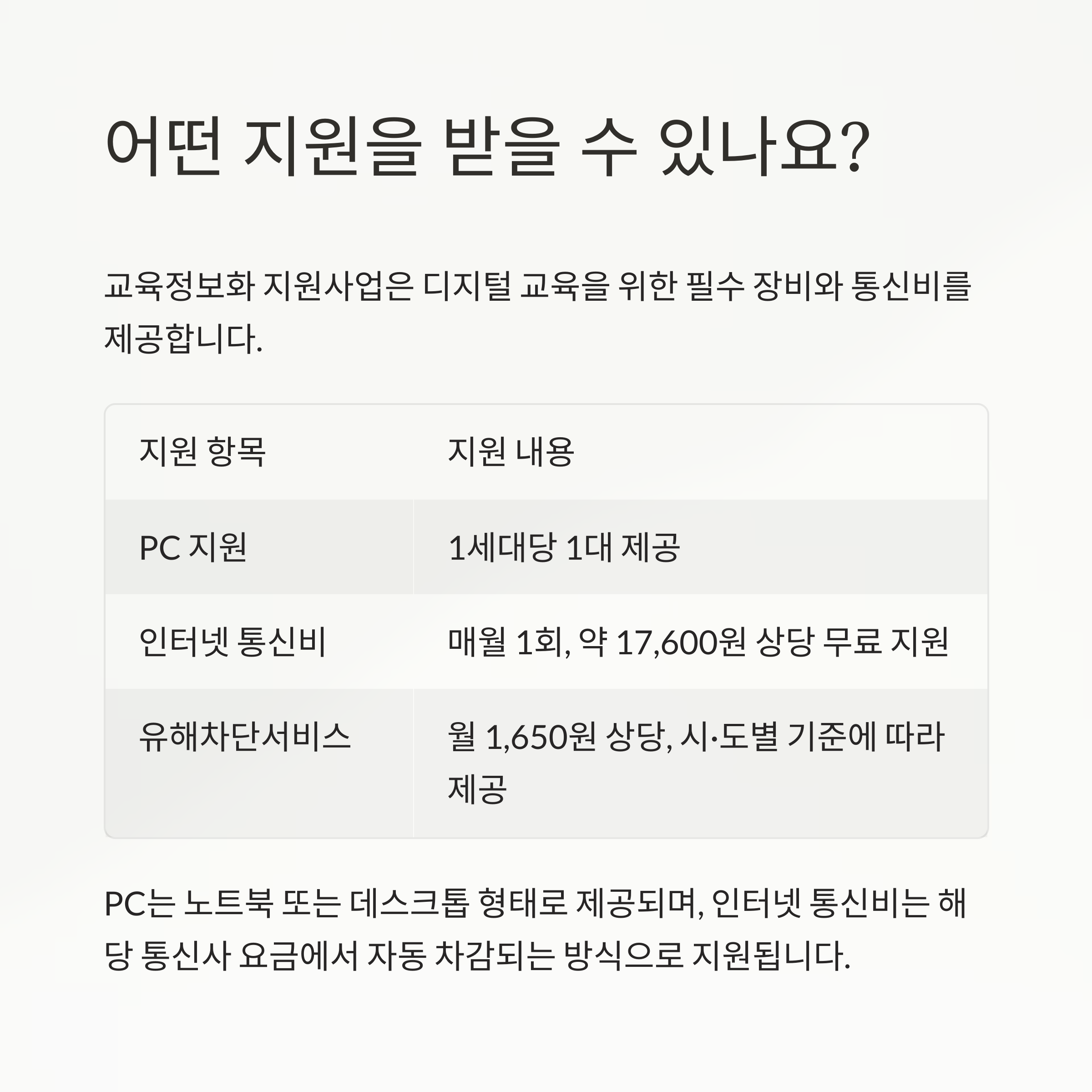 PC는 노트북 또는 데스크톱 형태로 제공되며, 인터넷 통신비는 해당 통신사 요금에서 자동 차감되는 방식으로 지원됩니다.