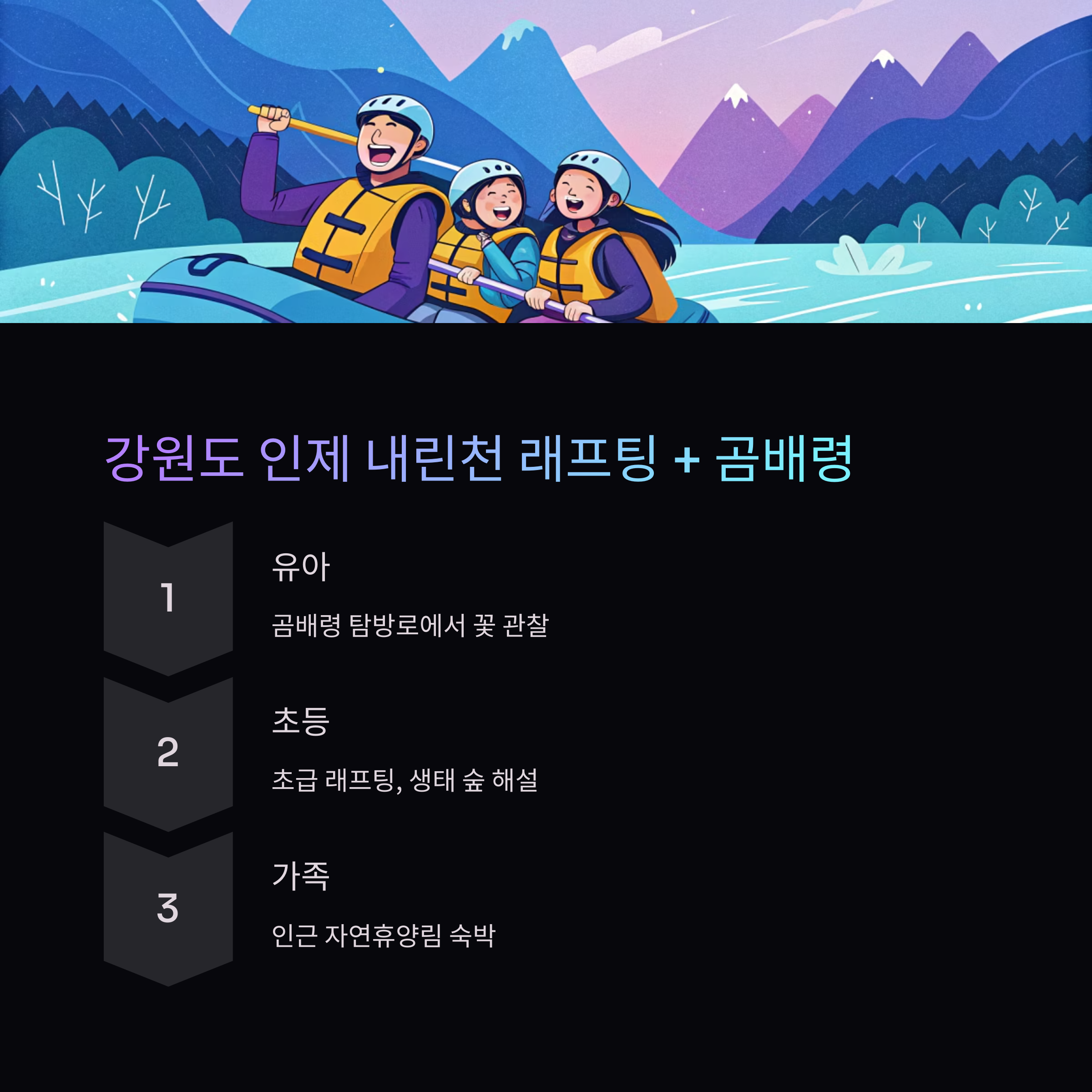 | 인제 | 곰배령 + 래프팅 | 자연 산책, 꽃 관찰 | 초급 래프팅, 숲 생태 체험 |