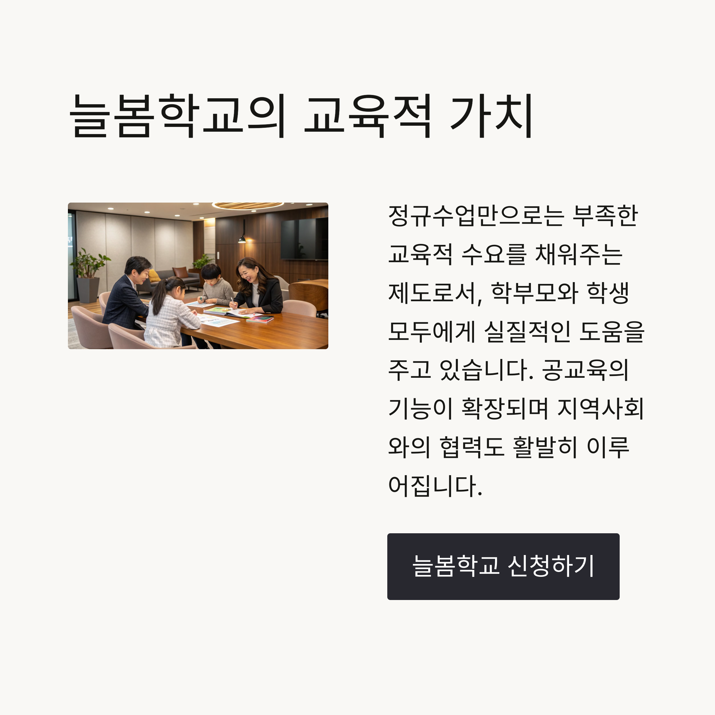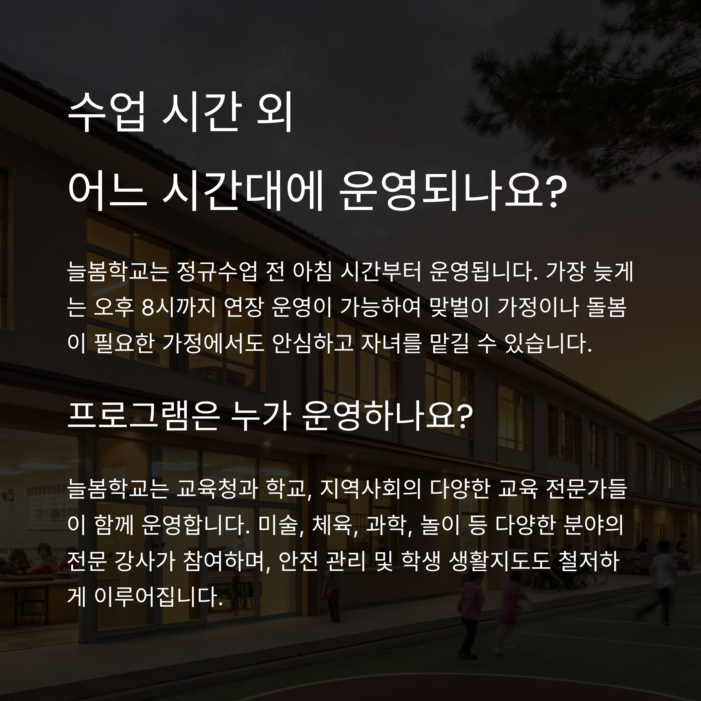 늘봄학교는 정규수업 이후 학생들이 가정으로 귀가하기 전까지 안전하고 의미 있는 시간을 보낼 수 있도록 돕는 종합형 교육 프로그램입니다. 지역사회, 학교, 공공기관의 다양한 자원을 활용해 양질의 콘텐츠를 제공합니다.