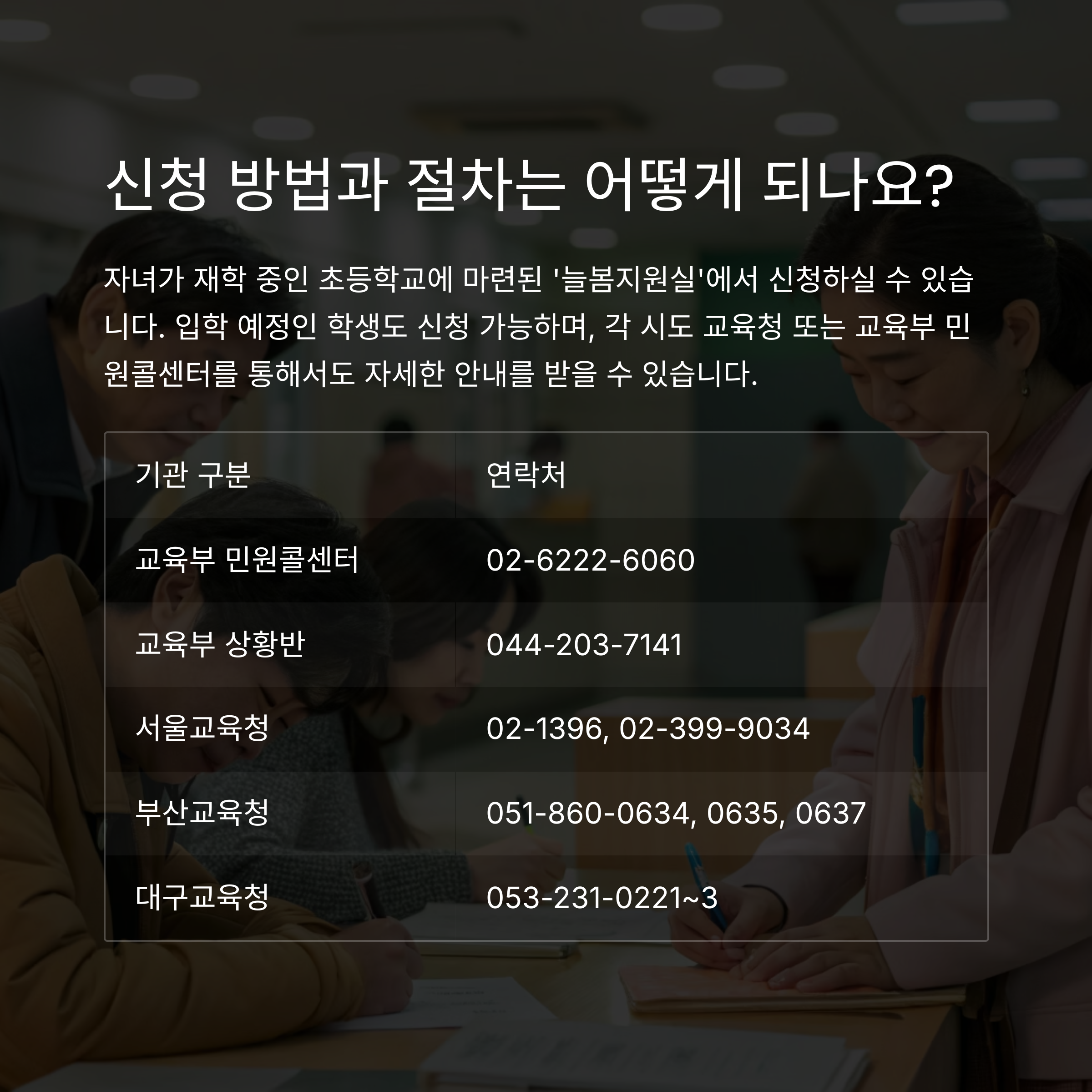 자녀가 재학 중인 초등학교에 마련된 ‘늘봄지원실’에서 신청하실 수 있습니다.