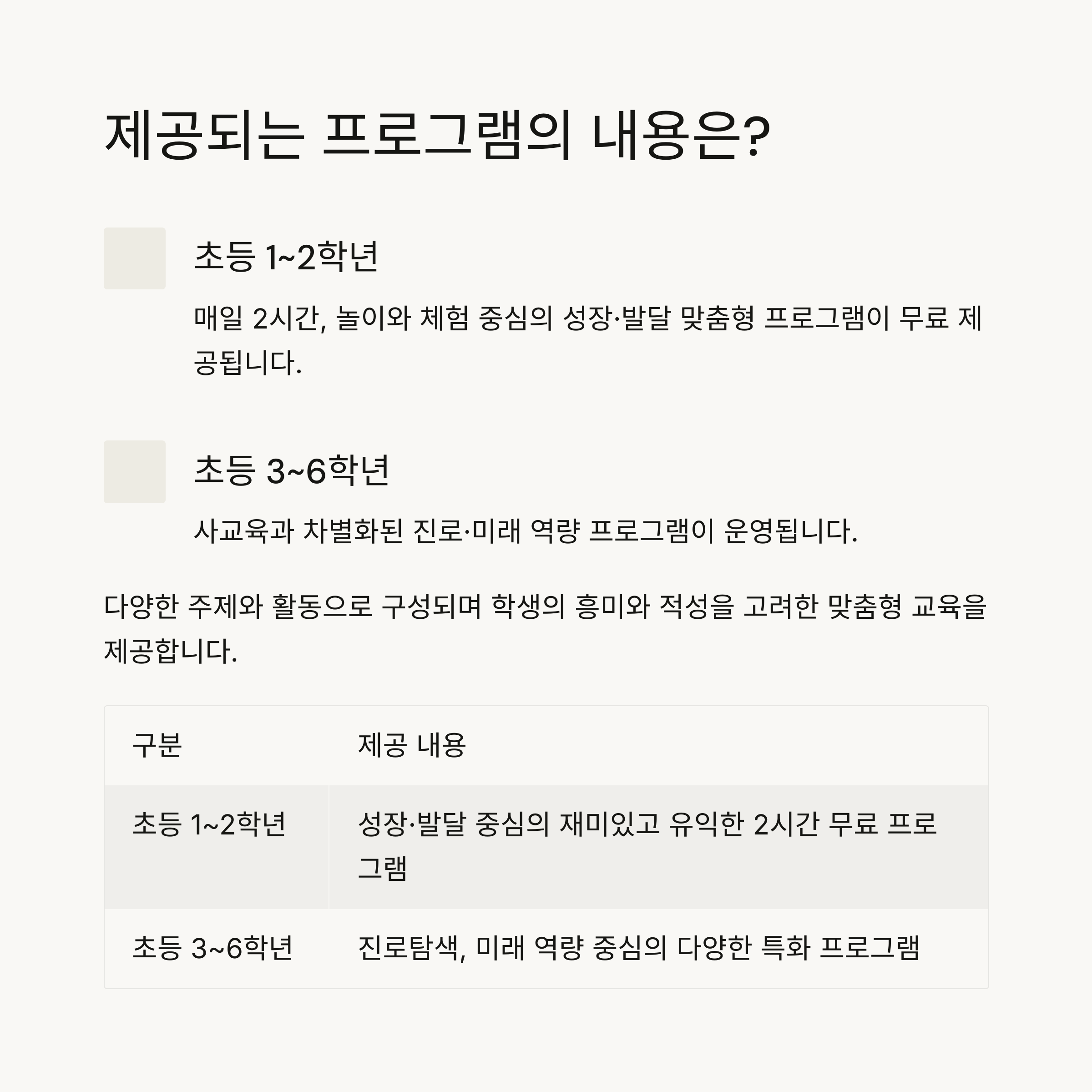 | 초등 3~6학년 | 진로탐색, 미래 역량 중심의 다양한 특화 프로그램 |