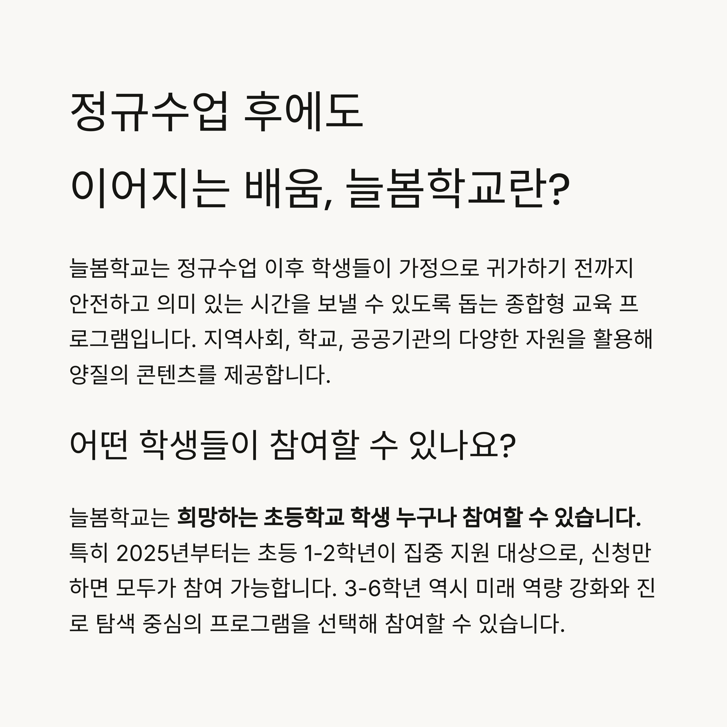 늘봄학교는 초등학생을 위한 새로운 교육 모델로, 기존의 방과후 학교와 돌봄 교실을 하나의 체제로 통합한 정책입니다. 교육부와 교육청이 함께 운영하며, 정규수업 외 시간에도 아이들이 안전하고 의미 있는 교육을 받을 수 있도록 돕습니다. 특히 2025년에는 초등 1~2학년이 집중 지원 대상이며, 방과후 2시간 동안 무료로 고품질 프로그램이 운영됩니다.
