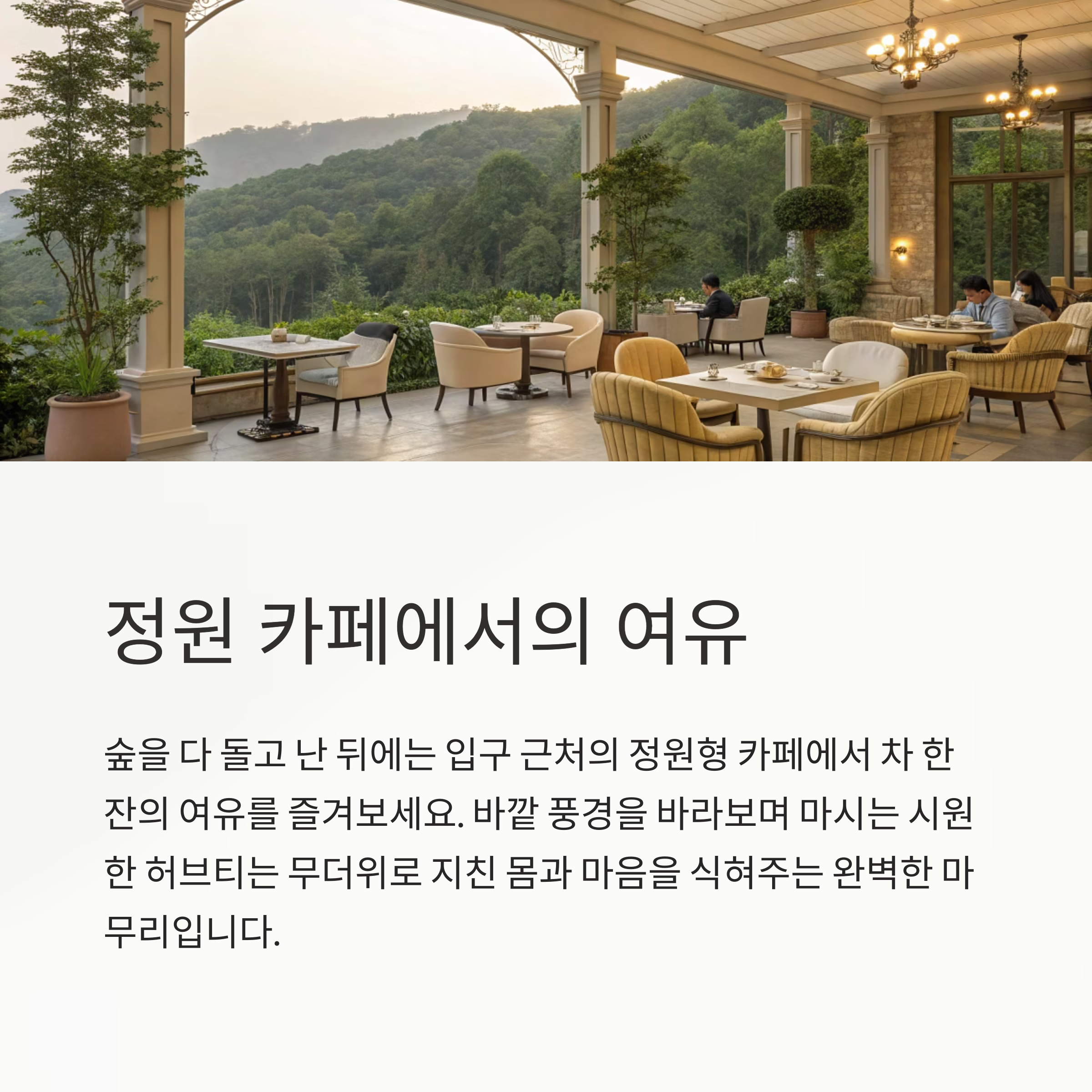 입구 근처의 정원형 카페에서 차 한 잔의 여유를 즐겨보세요.