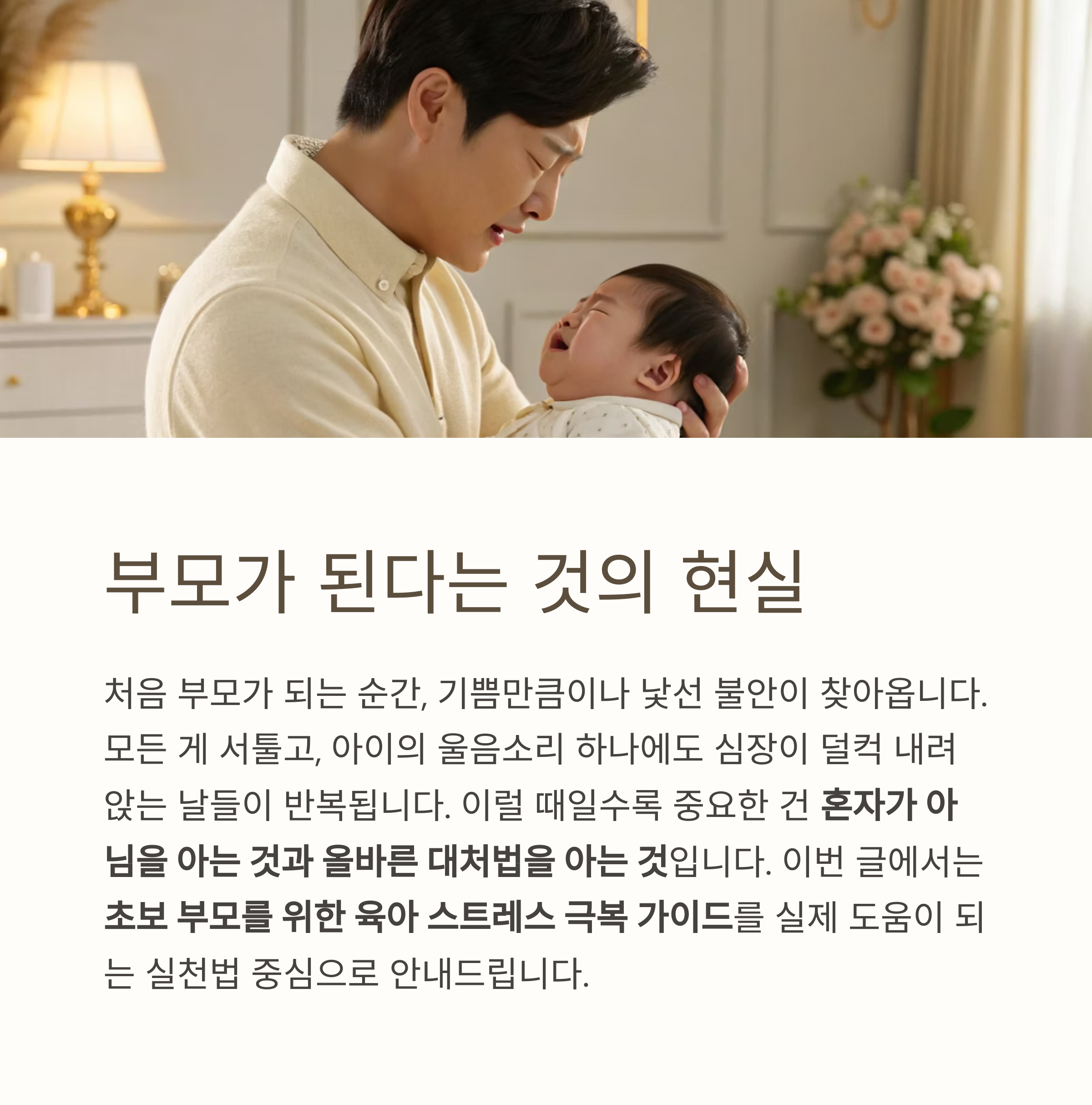 처음 부모가 되는 순간, 기쁨만큼이나 낯선 불안이 찾아옵니다.