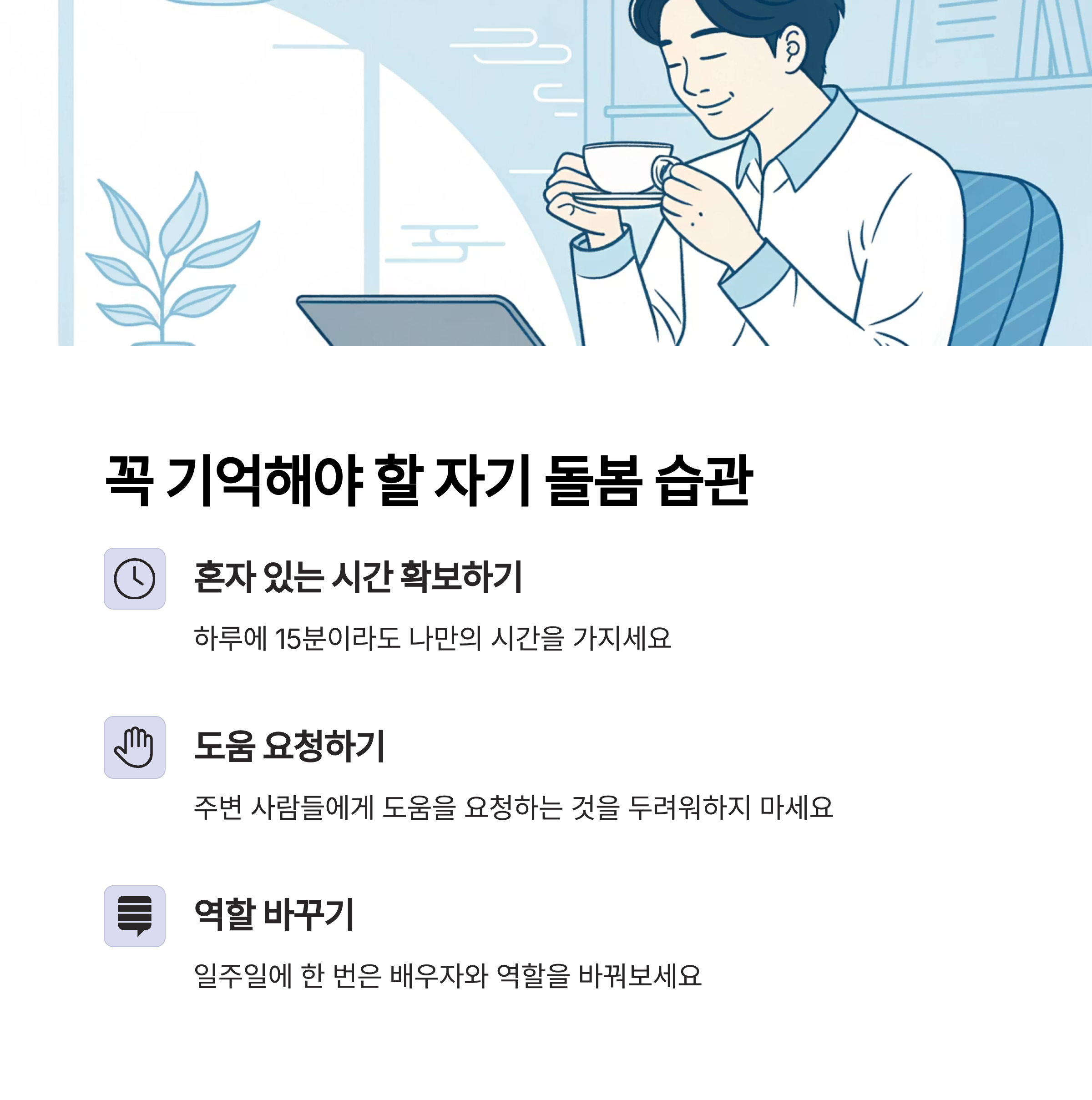 - 하루에 15분이라도 혼자 있는 시간 확보하기