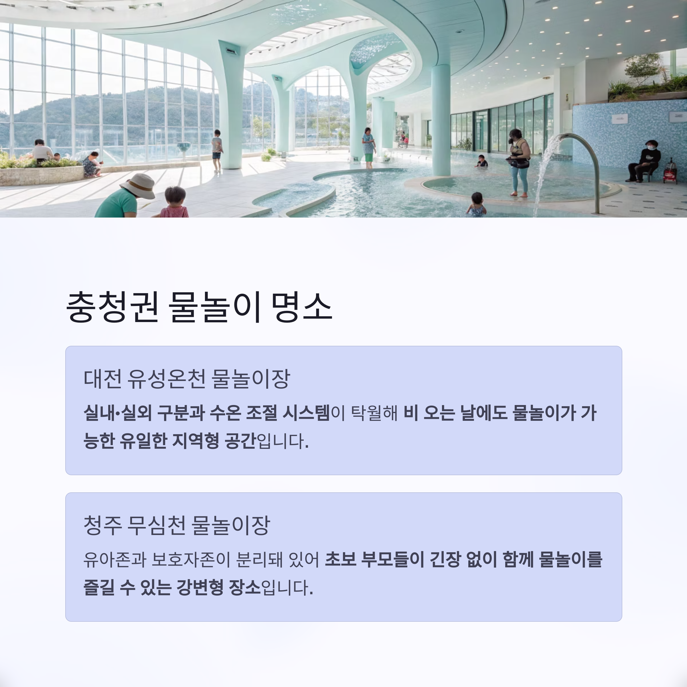 | 충청권 | 유성온천 물놀이장, 무심천 물놀이장 | 실내외 겸용, 수온 조절, 구역 분리 운영 |