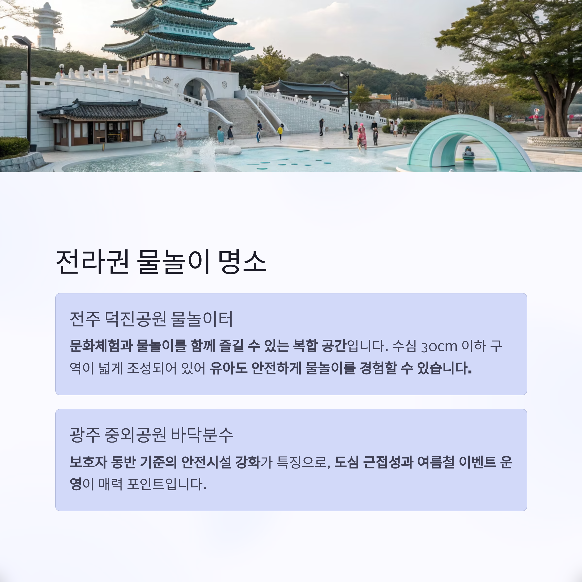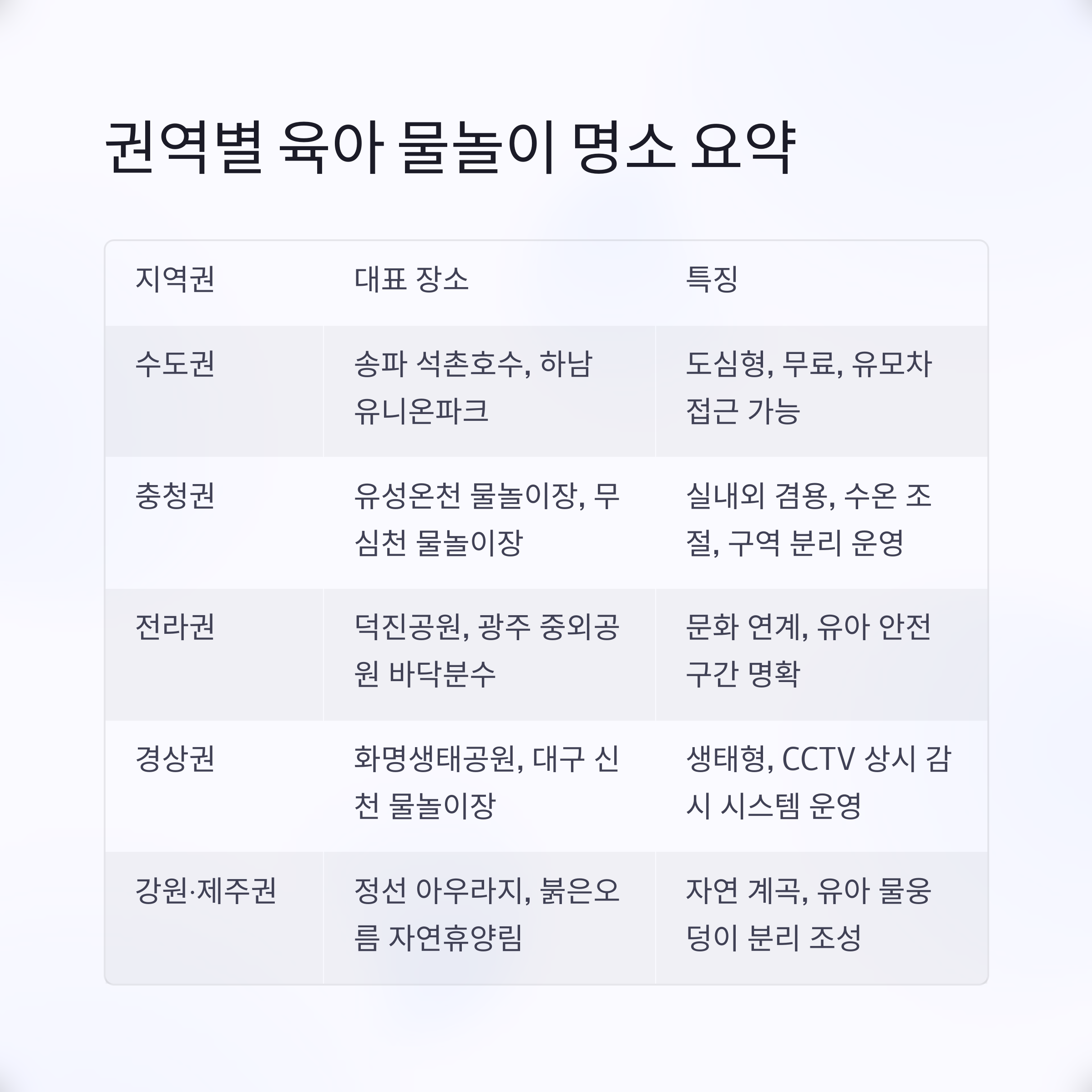 | 전라권 | 덕진공원, 광주 중외공원 바닥분수 | 문화 연계, 유아 안전 구간 명확 |
