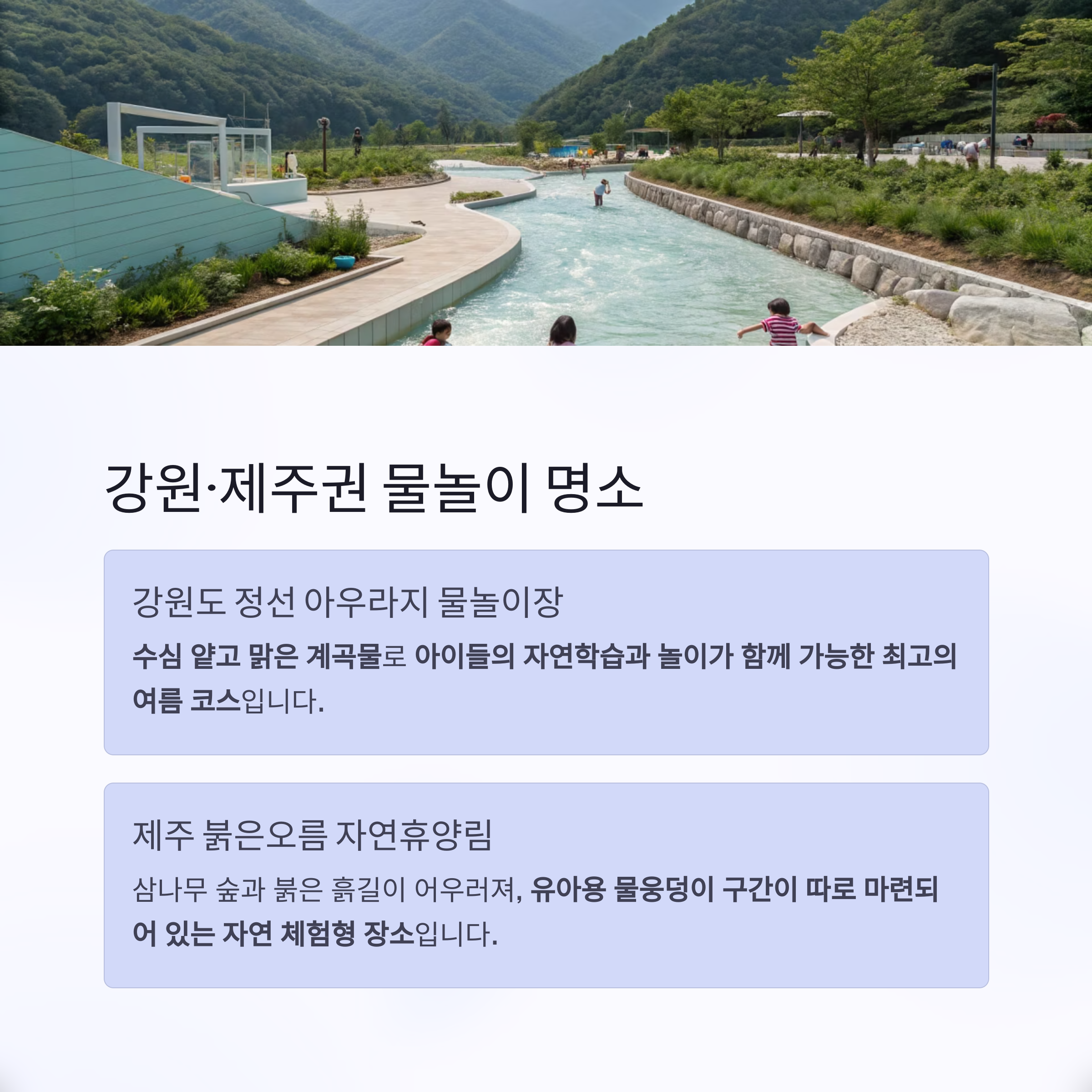 | 강원·제주권 | 정선 아우라지, 붉은오름 자연휴양림 | 자연 계곡, 유아 물웅덩이 분리 조성 |