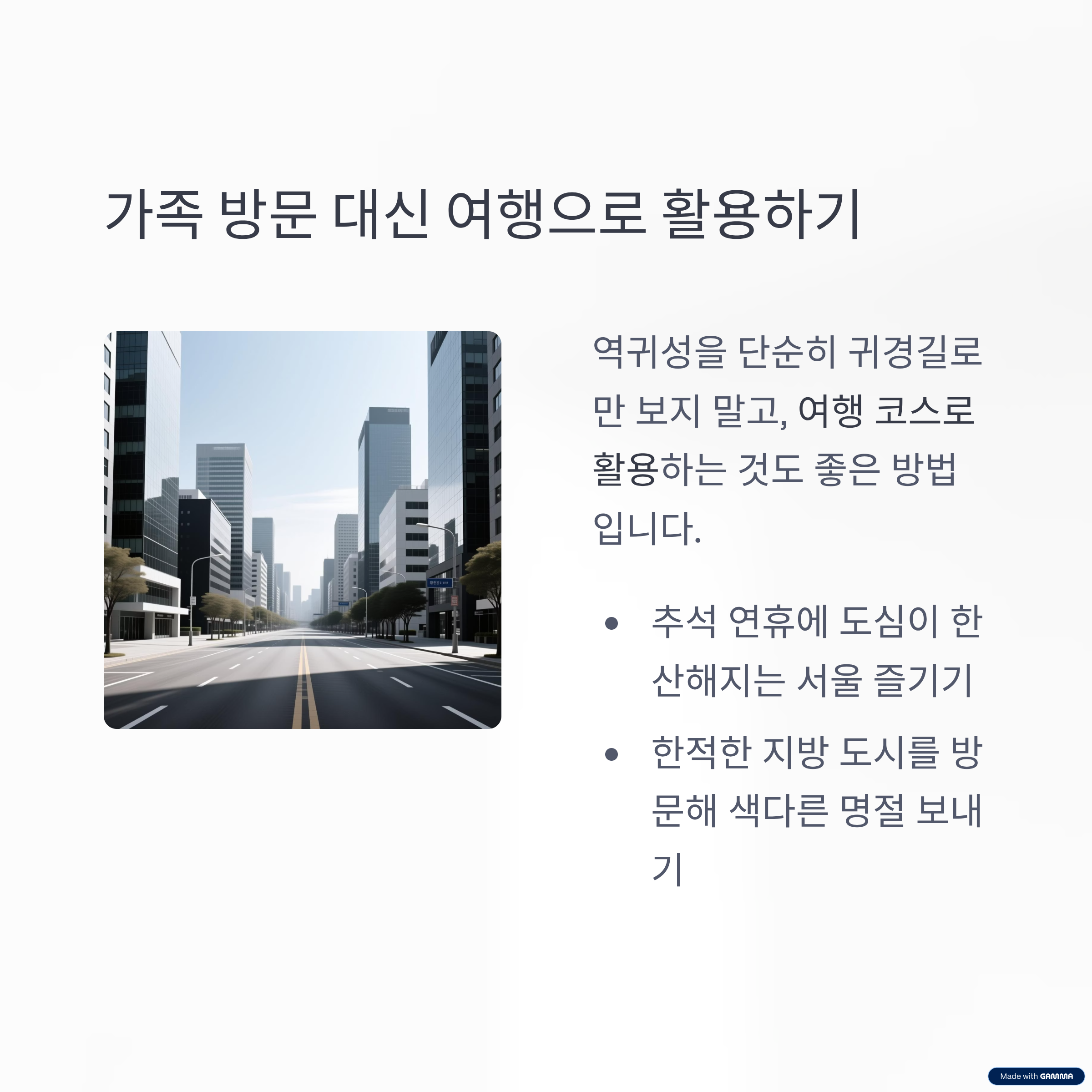 역귀성을 단순히 귀경길로만 보지 말고, 여행 코스로 활용하는 것도 좋은 방법입니다. 추석 연휴에 도심이 한산해지는 서울을 즐기거나, 한적한 지방 도시를 방문해 색다른 명절을 보내는 것도 매력적입니다.