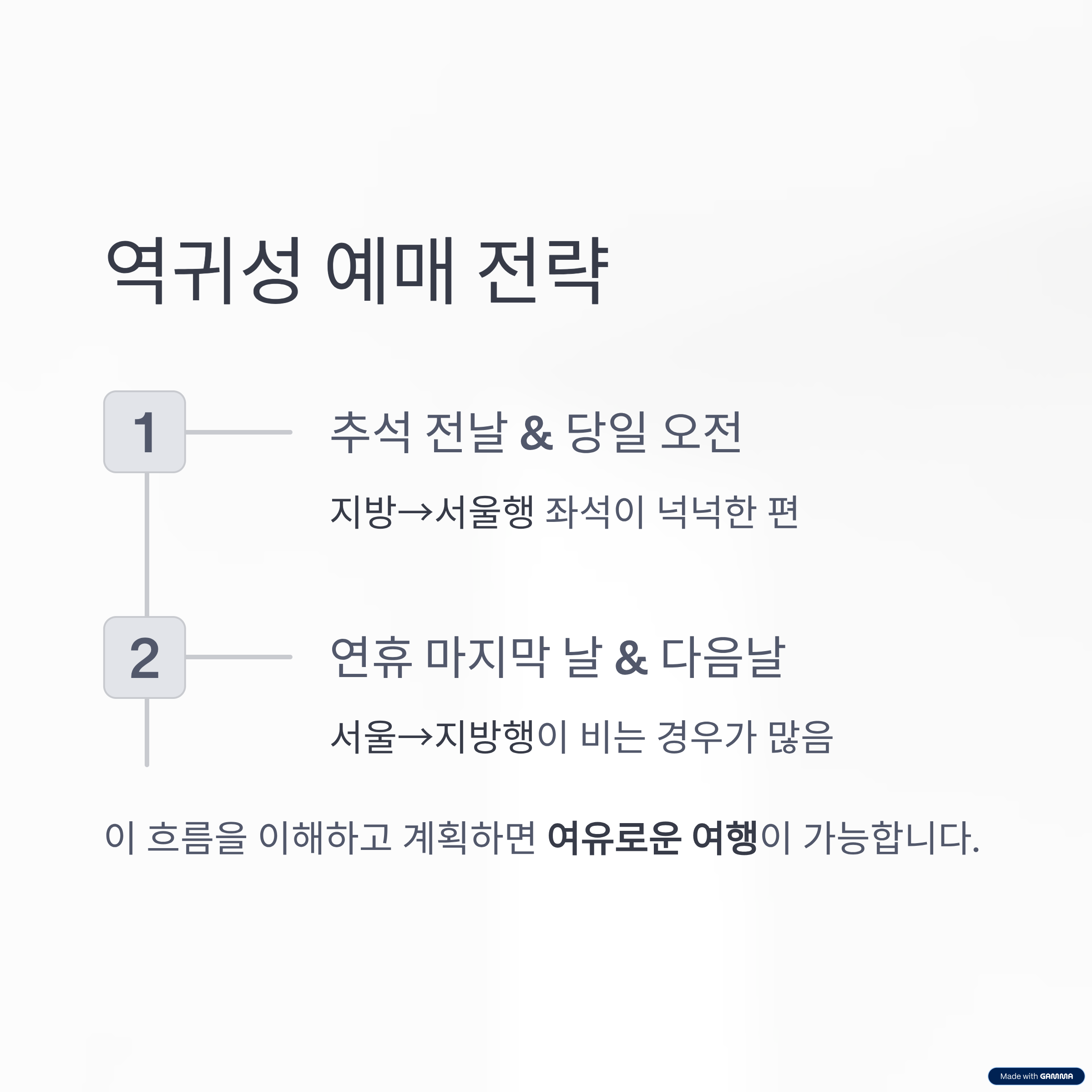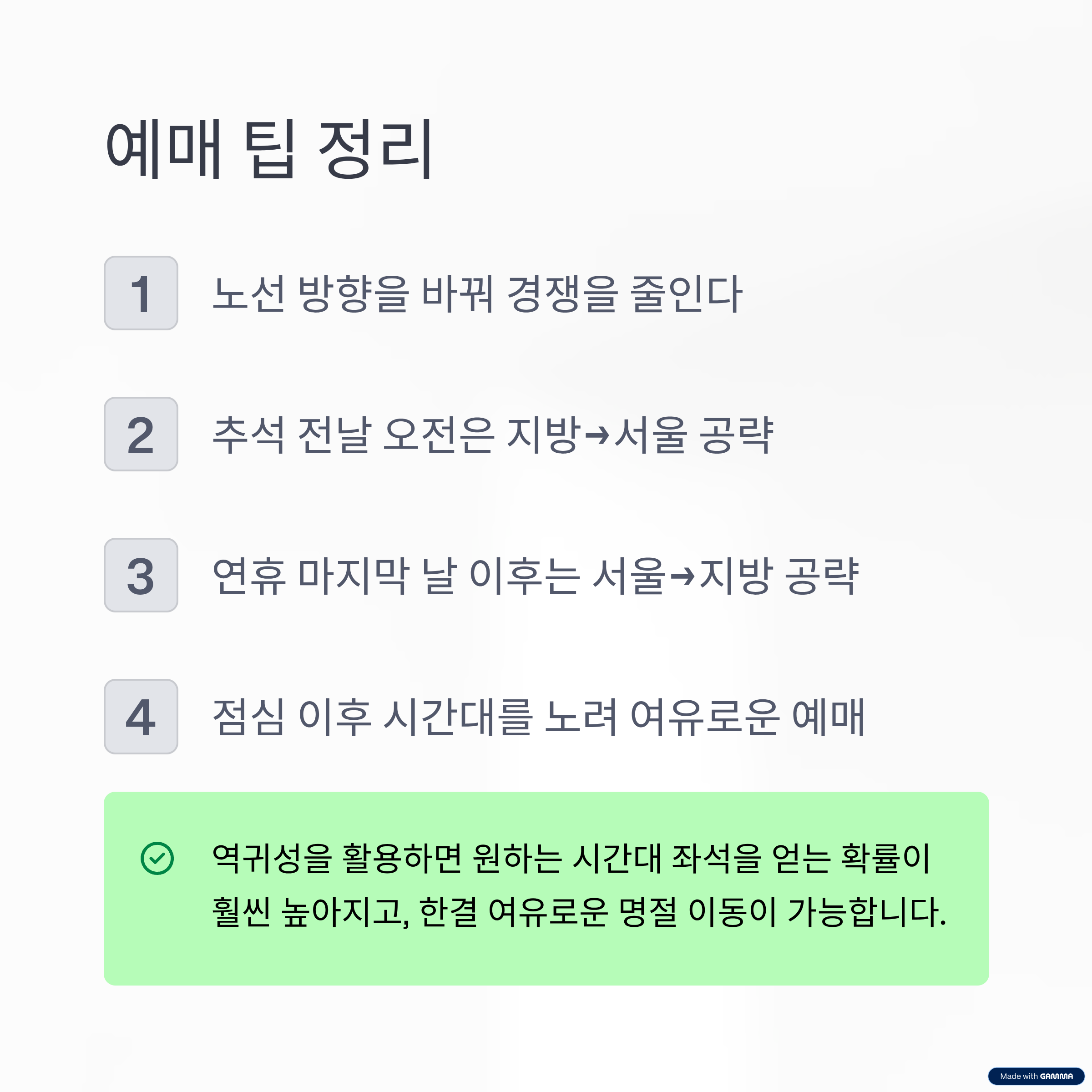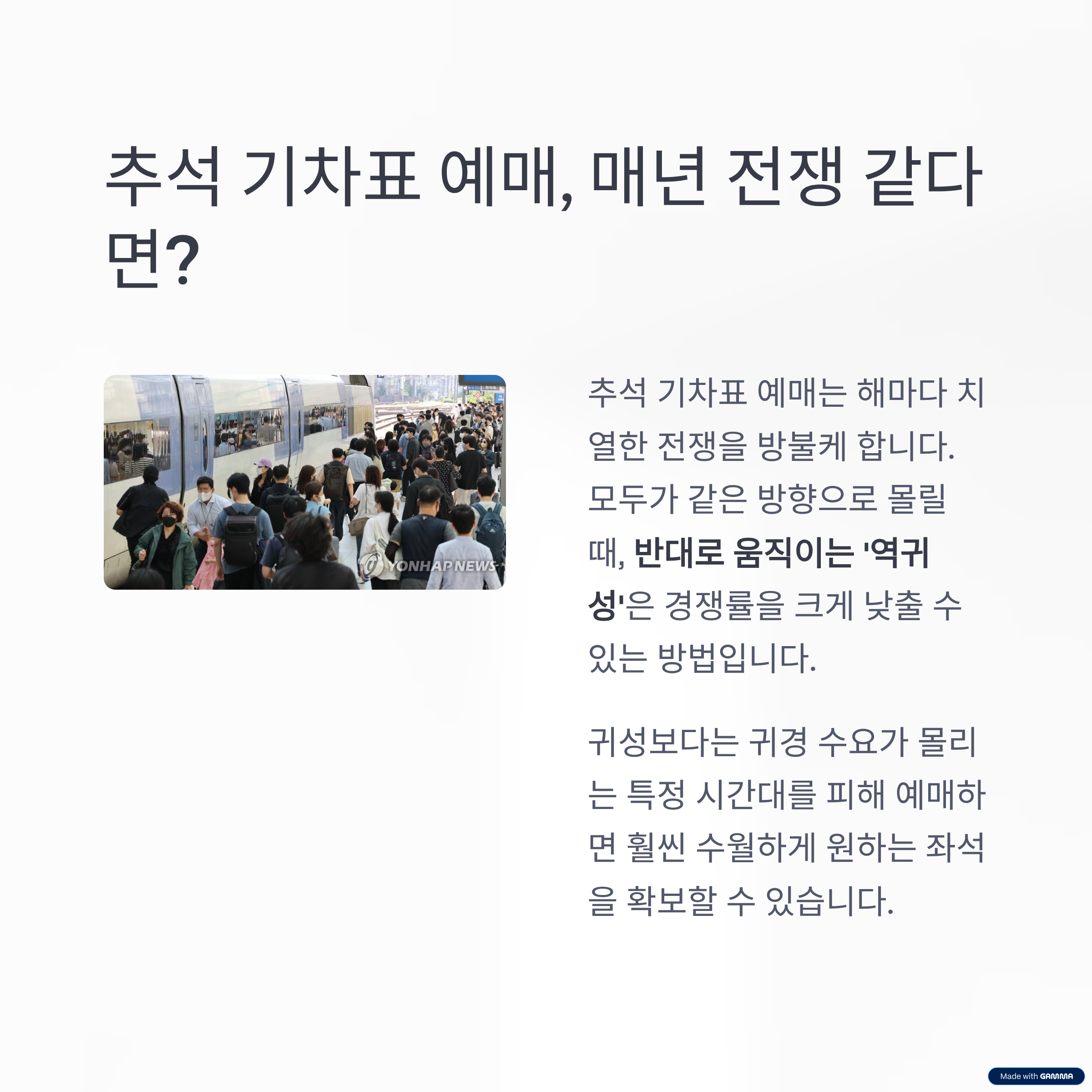 역귀성을 활용하면 원하는 시간대 좌석을 얻는 확률이 훨씬 높아지고, 한결 여유로운 명절 이동이 가능합니다.