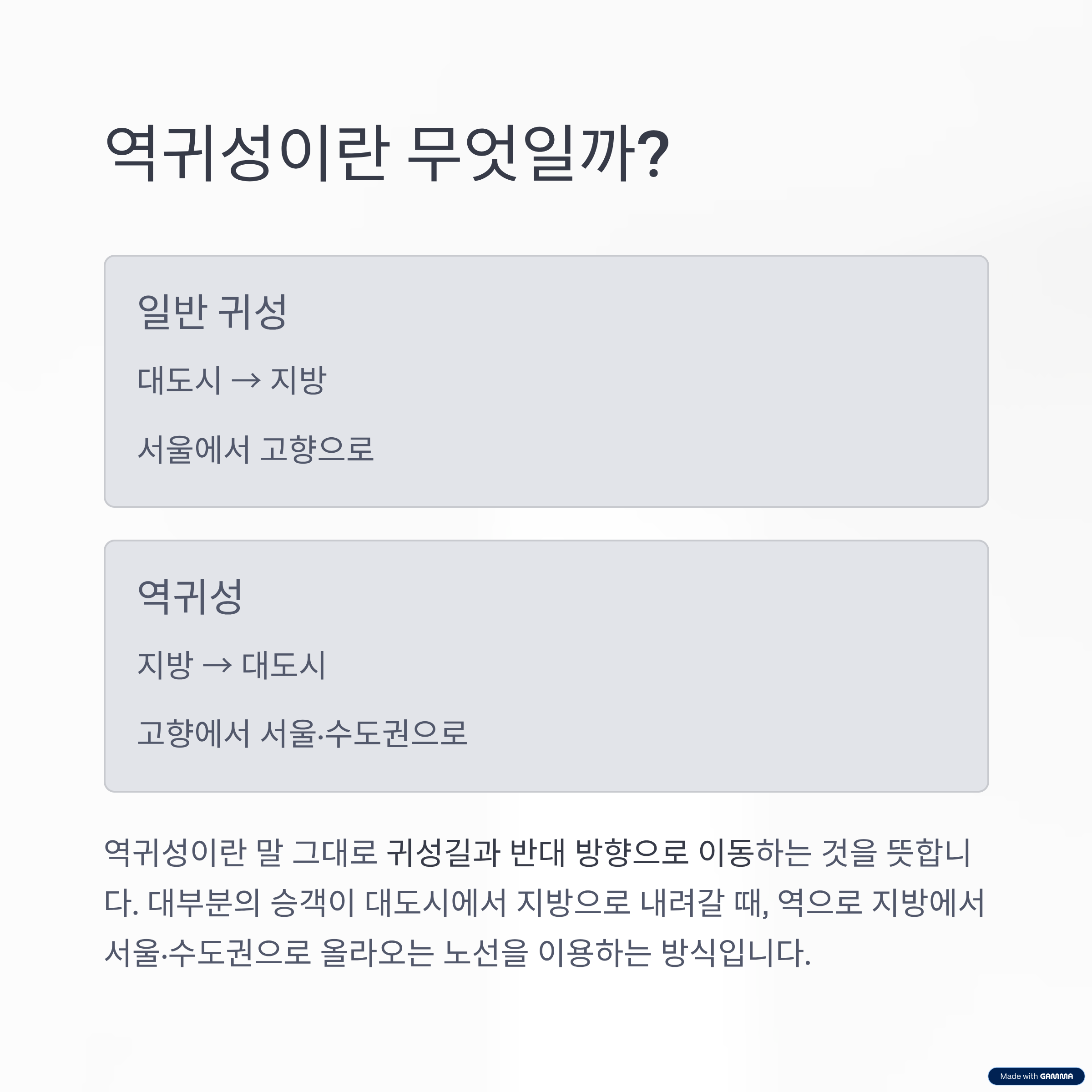 역귀성이란 말 그대로 귀성길과 반대 방향으로 이동하는 것을 뜻합니다. 대부분의 승객이 대도시에서 지방으로 내려갈 때, 역으로 지방에서 서울·수도권으로 올라오는 노선을 이용하는 방식입니다.
