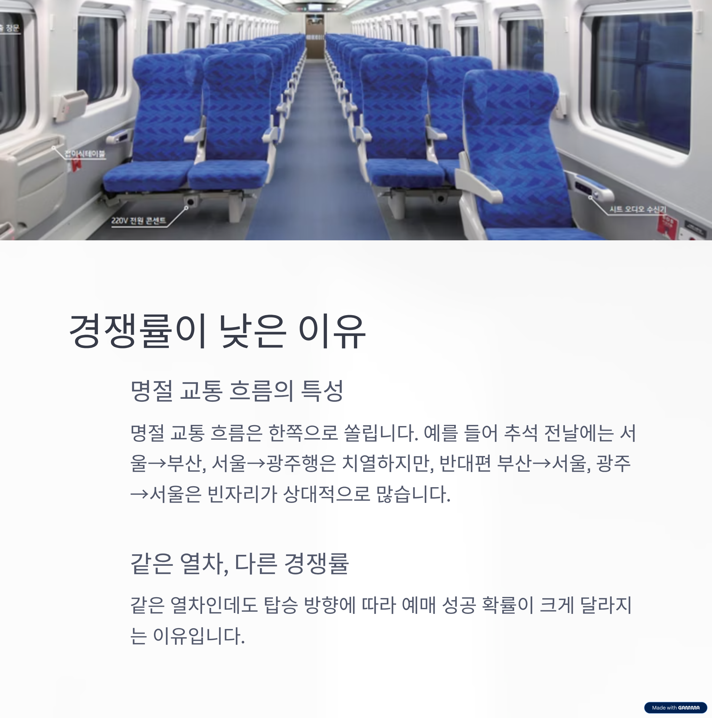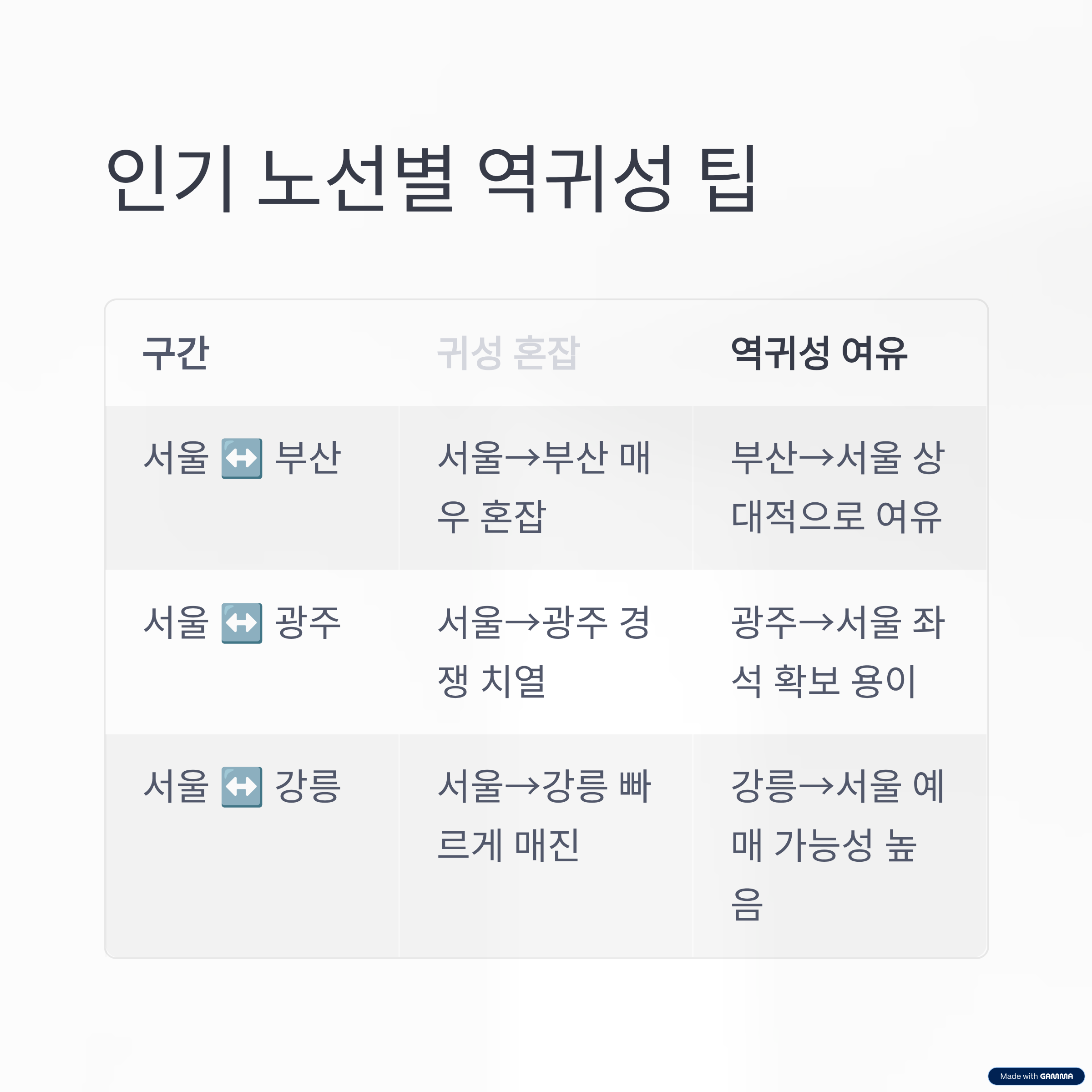 | 서울 ↔ 광주 | 서울→광주 경쟁 치열 | 광주→서울 좌석 확보 용이 |