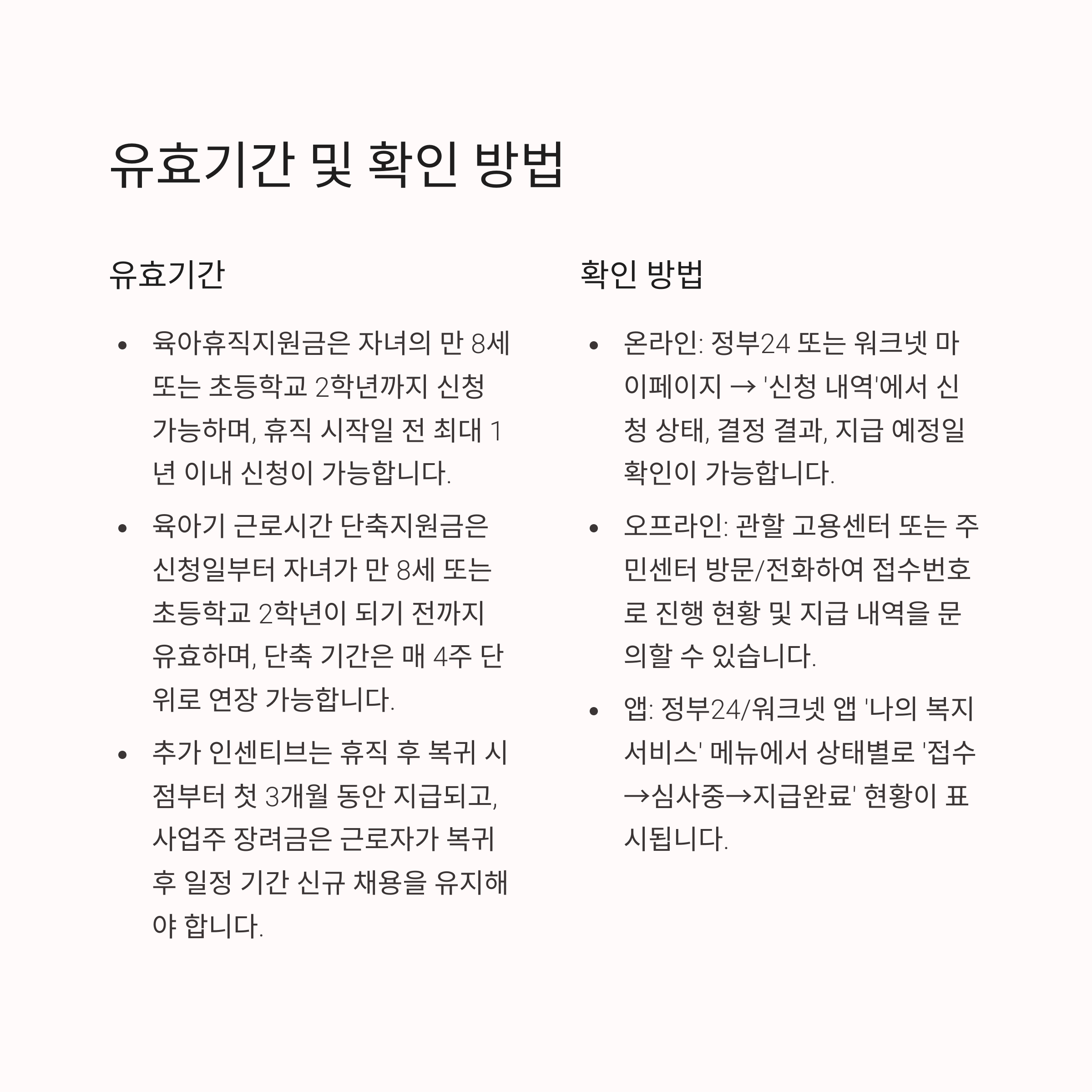 ② 육아기 근로시간 단축지원금은 신청일부터 자녀가 만 8세 또는 초등학교 2학년이 되기 전까지 유효하며, 단축 기간은 매 4주 단위로 연장 가능합니다.