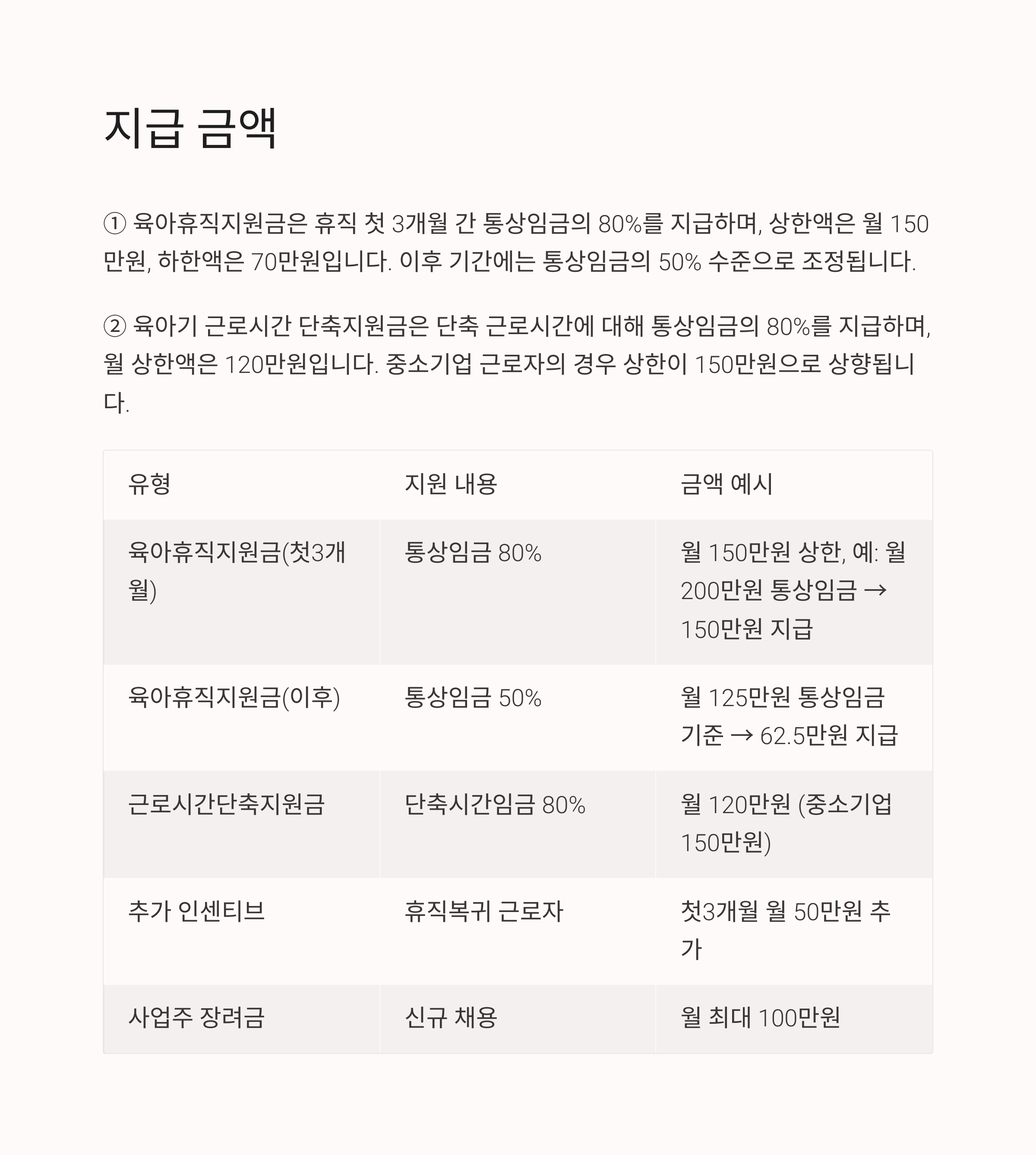 ② 육아기 근로시간 단축지원금은 단축 근로시간에 대해 통상임금의 80%를 지급하며, 월 상한액은 120만원입니다. 중소기업 근로자의 경우 상한이 150만원으로 상향됩니다.