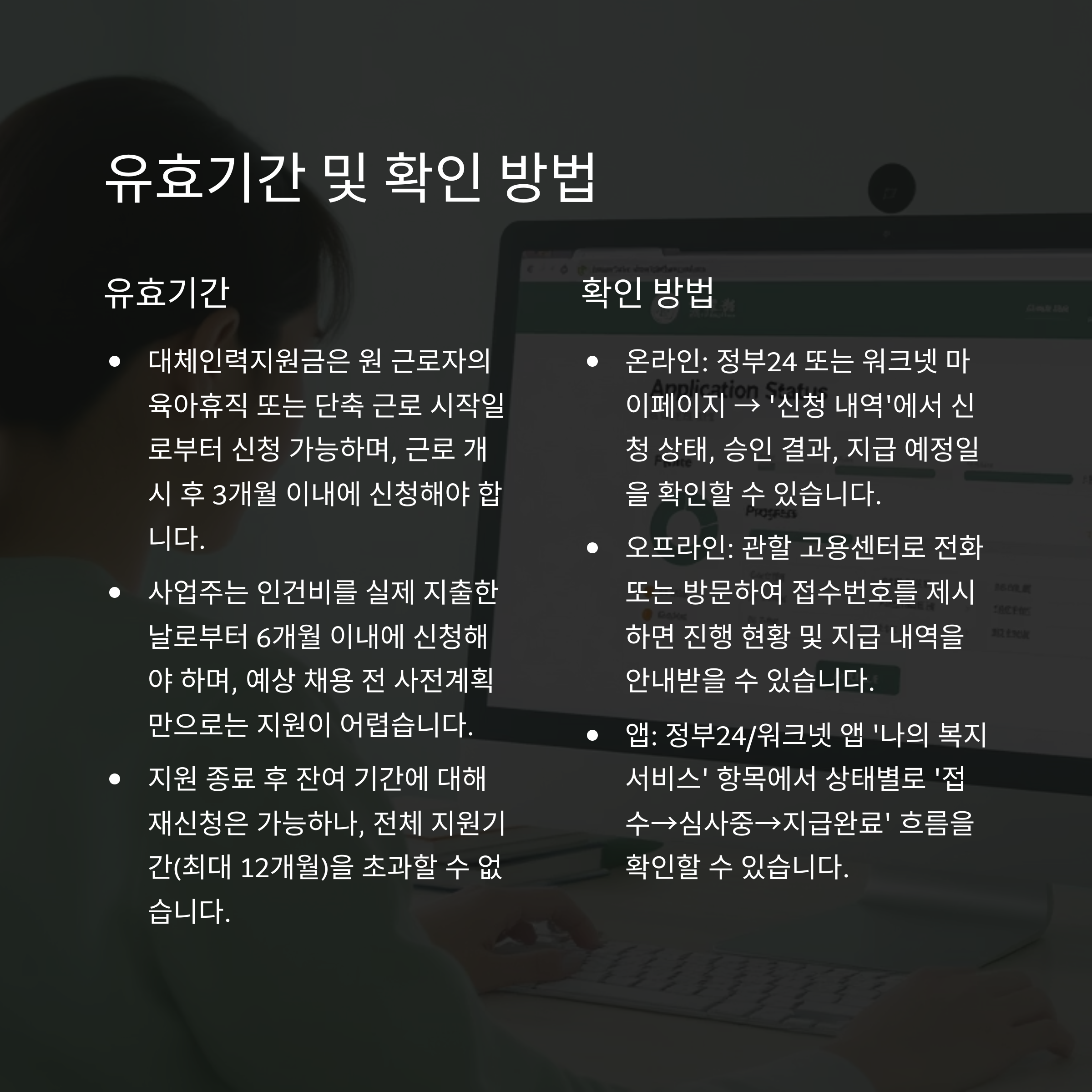 ② 오프라인 신청: 관할 고용센터 방문 또는 우편 제출로 신청이 가능합니다. 신청서, 사업자등록증, 채용 계획서, 근로계약서 사본 및 대체 인력 인건비 명세서를 포함해 제출합니다.