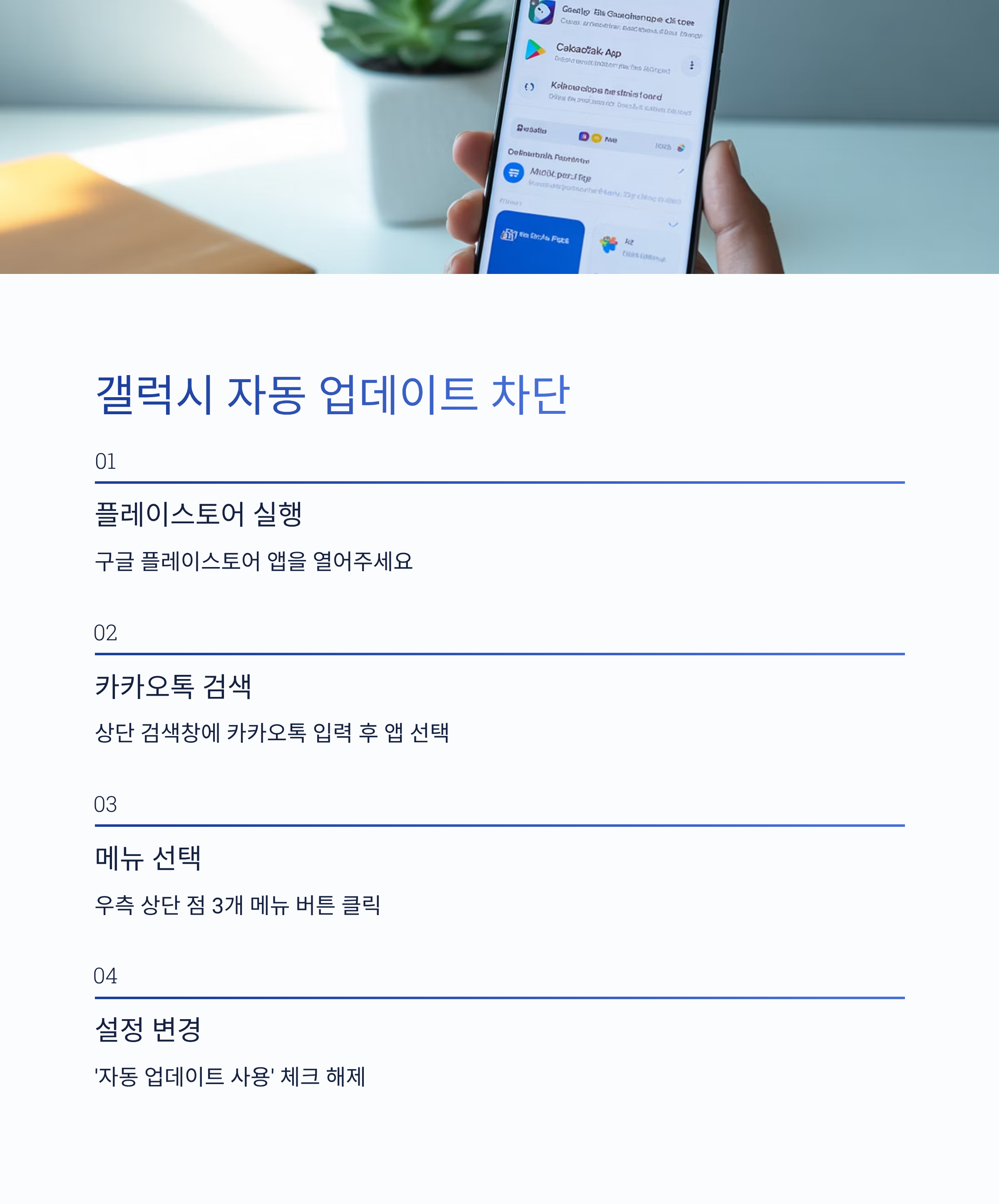 | 삼성 갤럭시 (Android) | 플레이스토어 > 카카오톡 검색 > 점 3개 메뉴 > ‘자동 업데이트 사용’ 해제 |