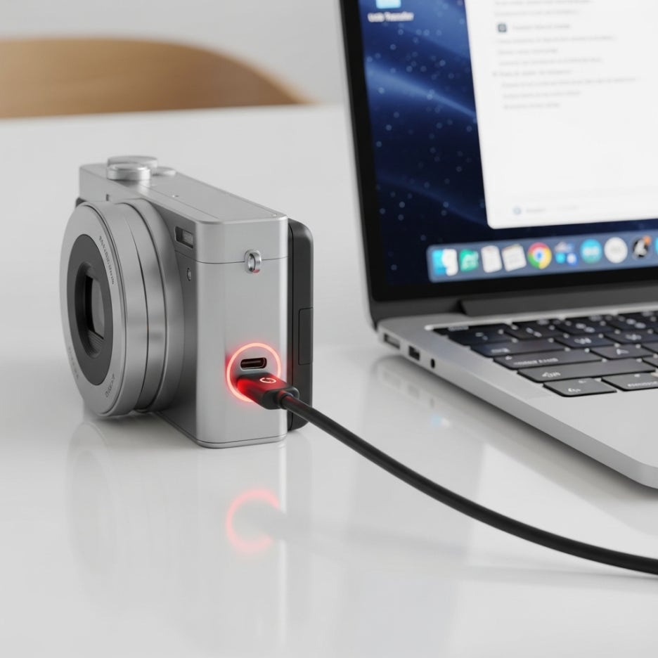 구성품에 포함된 Micro 5핀 USB 케이블을 카메라 측면 단자에 연결하고 어댑터나 컴퓨터에 꽂으면 돼요.