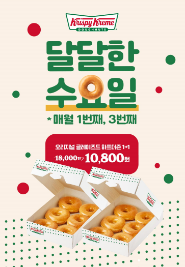 크리스피 크림 도넛의 대표 인기 행사인 1+1 수요일 이벤트는 매월 첫째 주와 셋째 주 수요일에 진행됩니다.