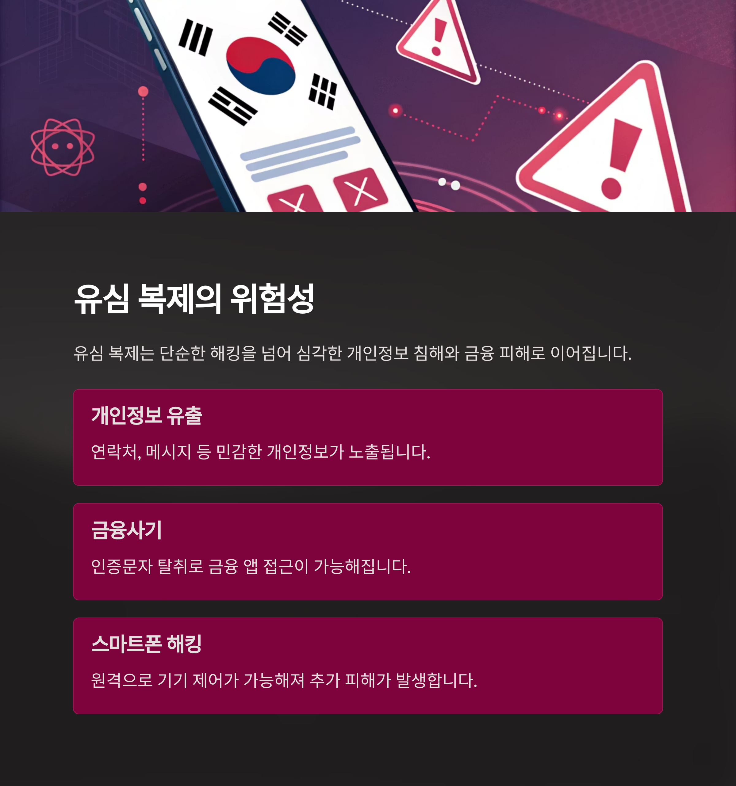- A: 금융 앱 접속, 문자 인증 탈취, 개인정보 유출 등이 발생할 수 있습니다.