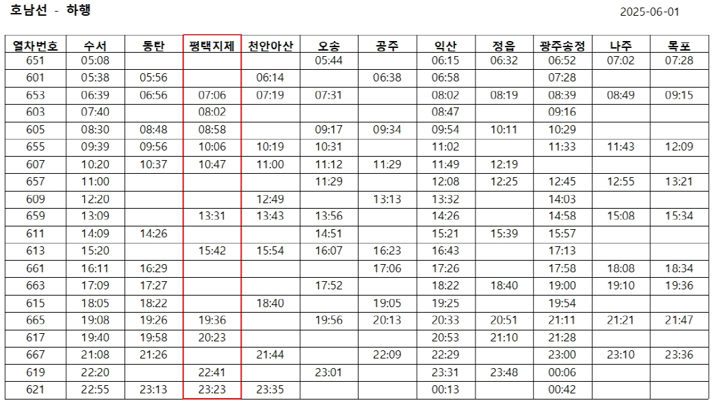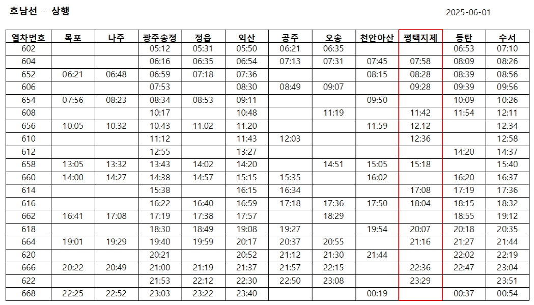 지제역 출발 하행(호남선·전라선) 주요 시간표