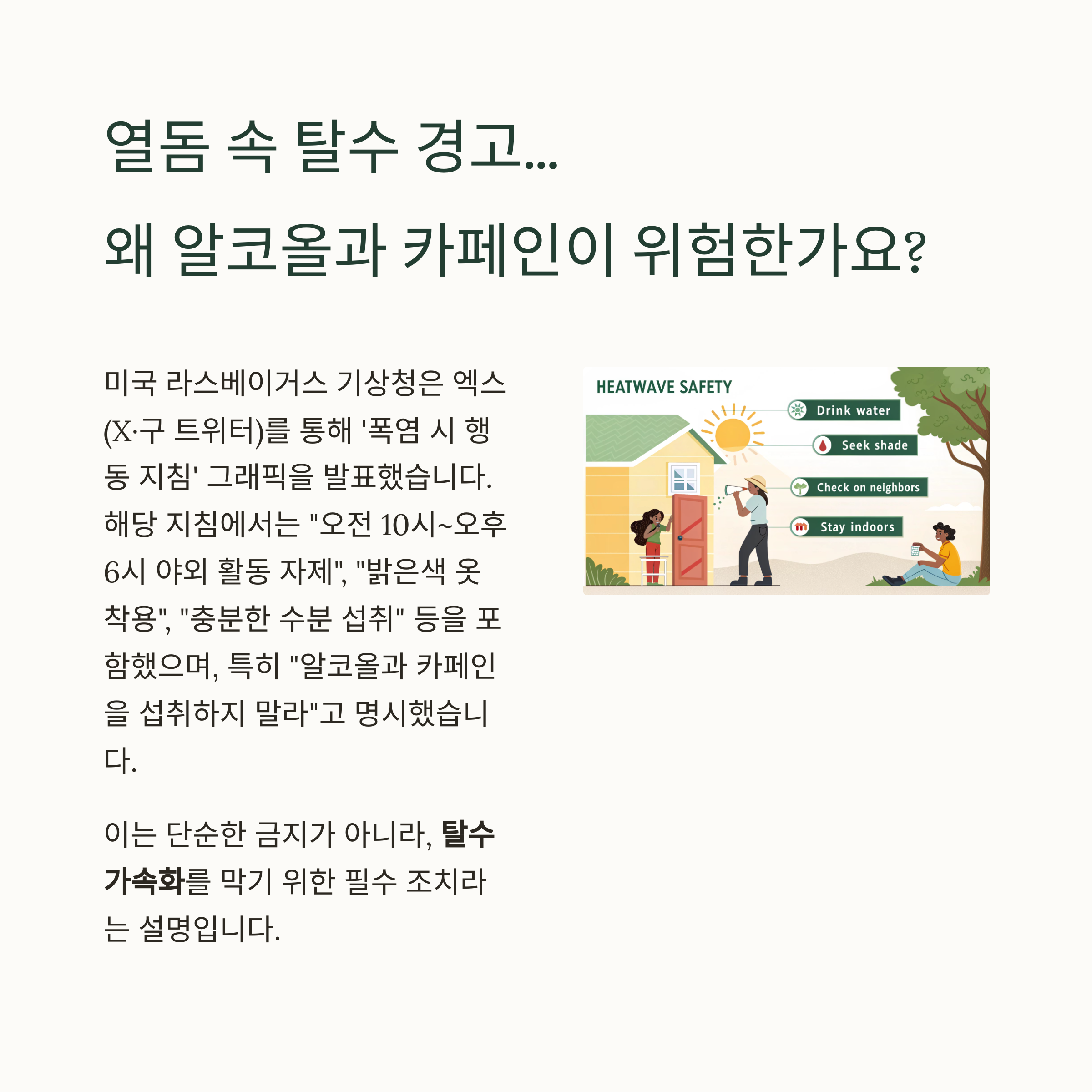 미국 전역에 ‘열돔(Heat Dome)’ 현상이 몰아치며 폭염 경보가 잇따르는 가운데, 미 국립기상청(NWS)은 시민들에게 “폭염 속에는 술과 커피를 삼가라”고 공식 권고했습니다. 일상에서 익숙한 음료지만, 과연 왜 폭염 상황에서는 자제해야 할까요? 단순한 조언이 아닌 과학적 근거와 건강상의 이유를 바탕으로, 미국 기상청과 전문가들이 왜 이 같은 주의를 당부했는지 살펴봅니다.