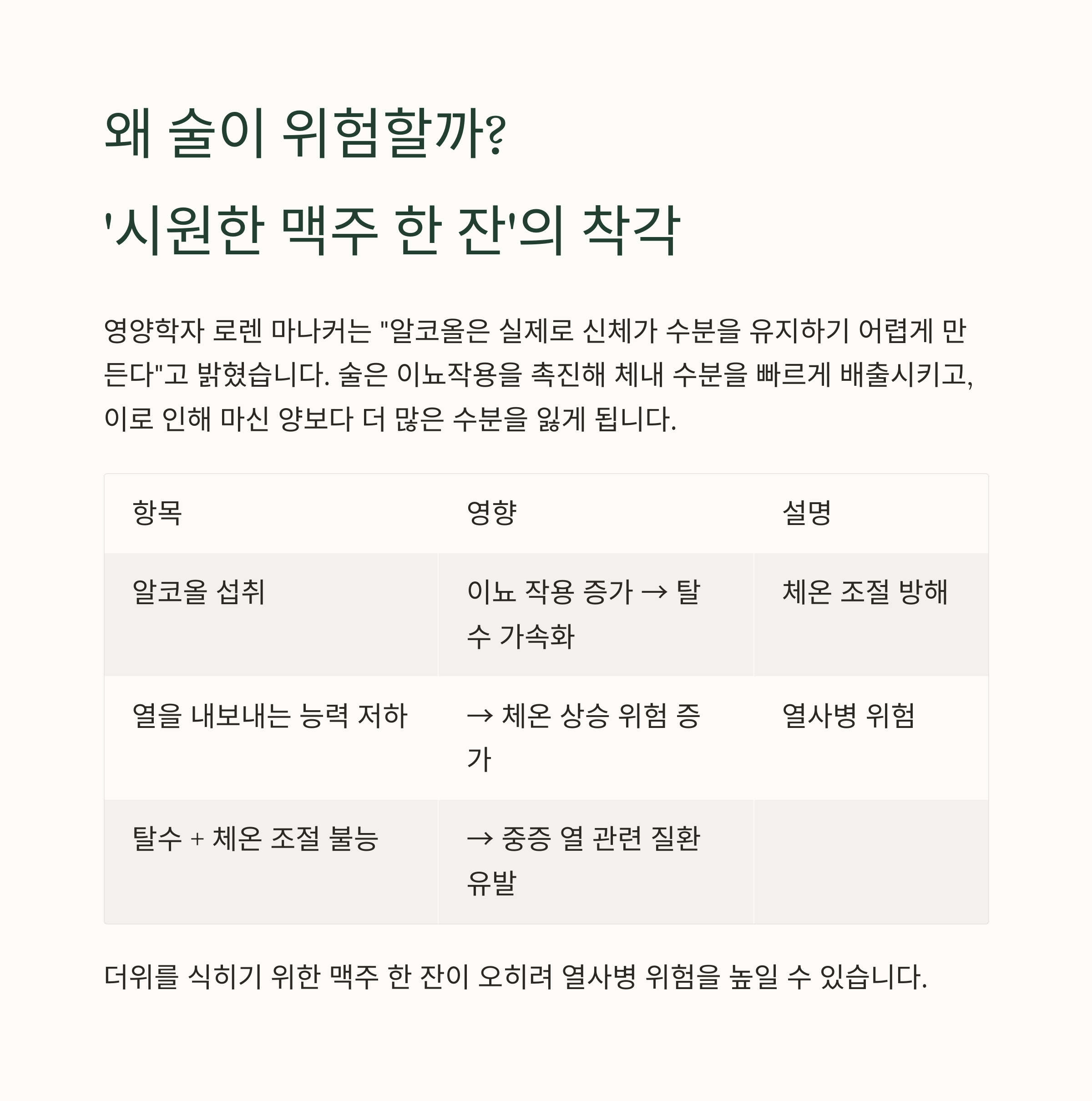 더위를 식히기 위한 맥주 한 잔이 오히려 열사병 위험을 높일 수 있습니다.