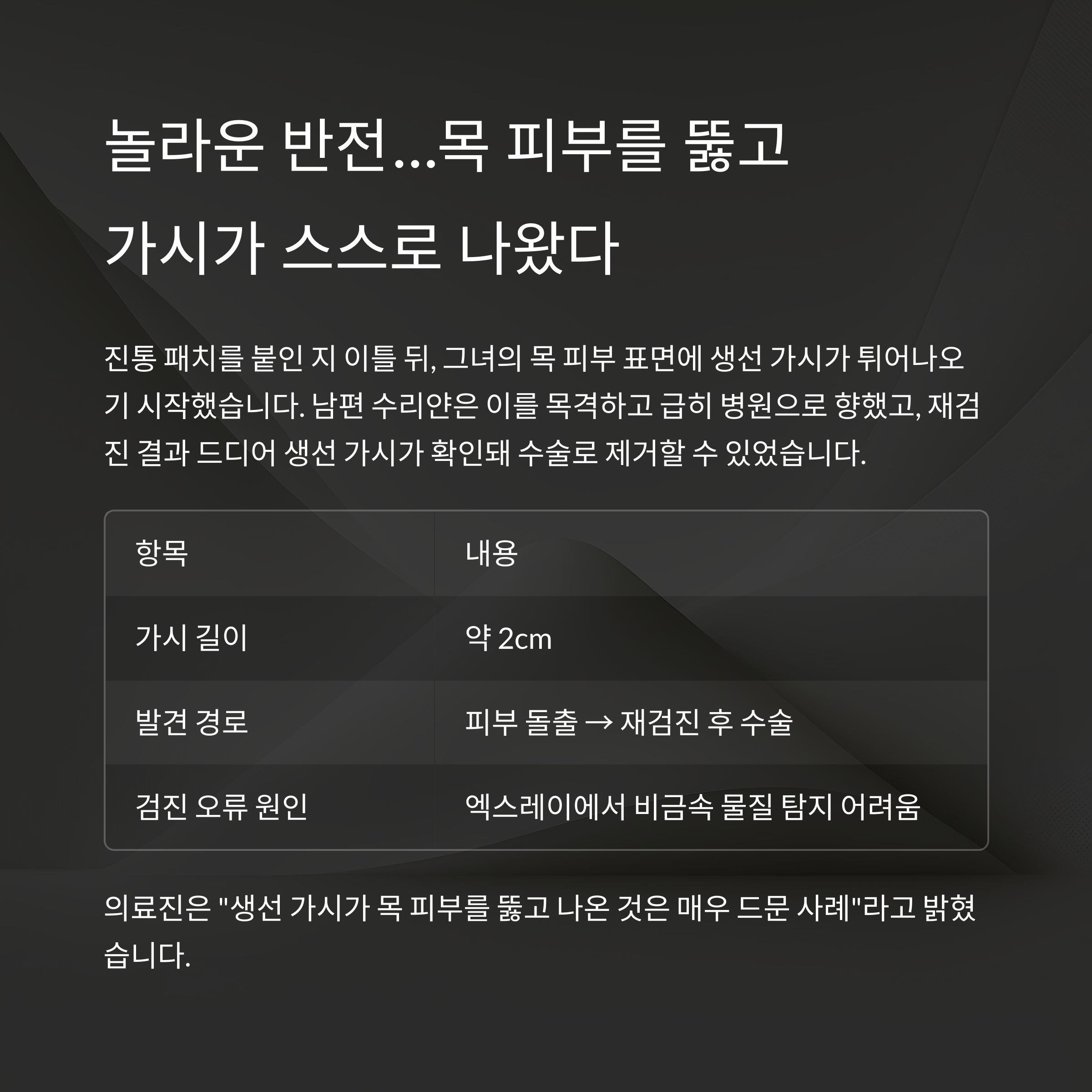 | 발견 경로 | 피부 돌출 → 재검진 후 수술 |