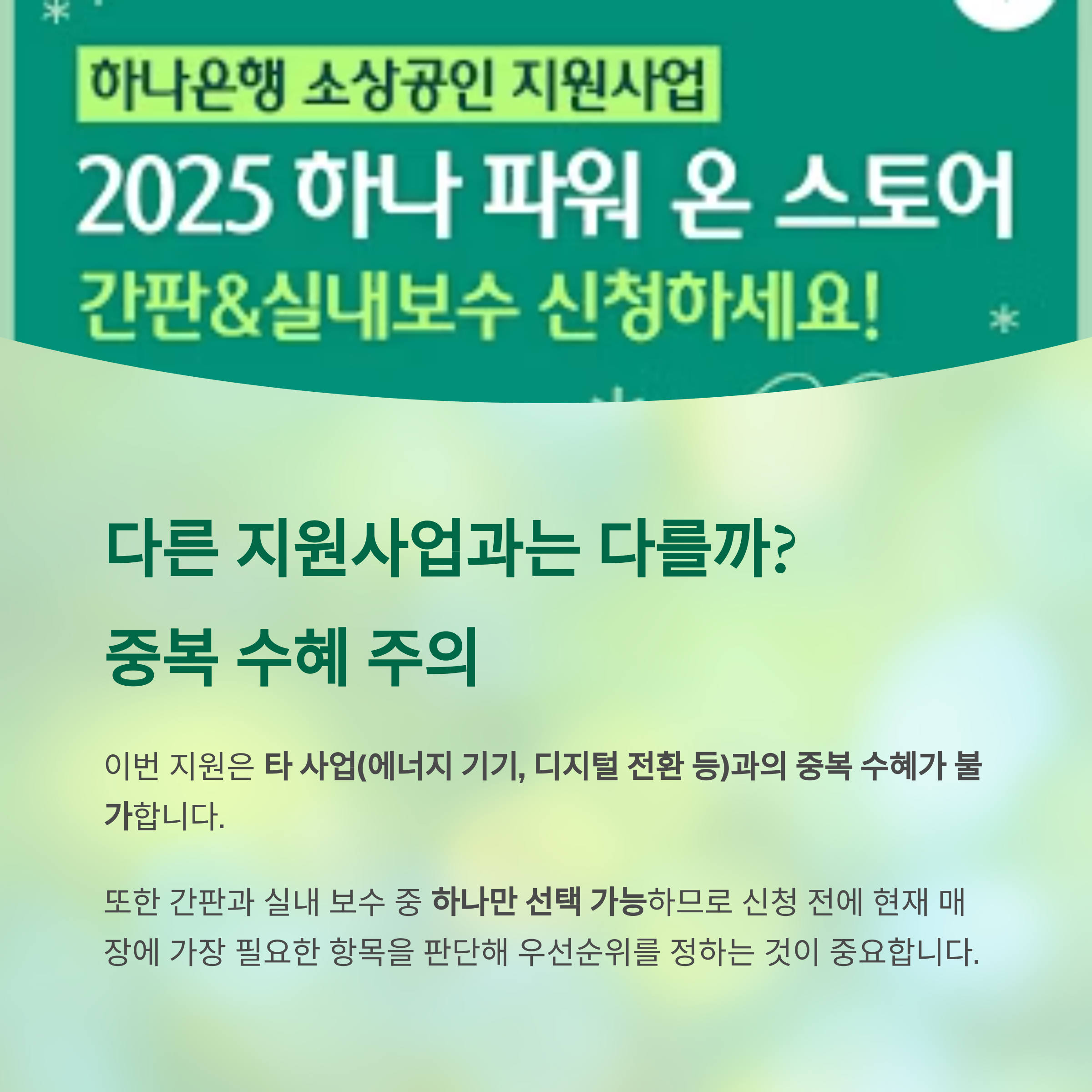 이번 지원은 타 사업(에너지 기기, 디지털 전환 등)과의 중복 수혜가 불가합니다.