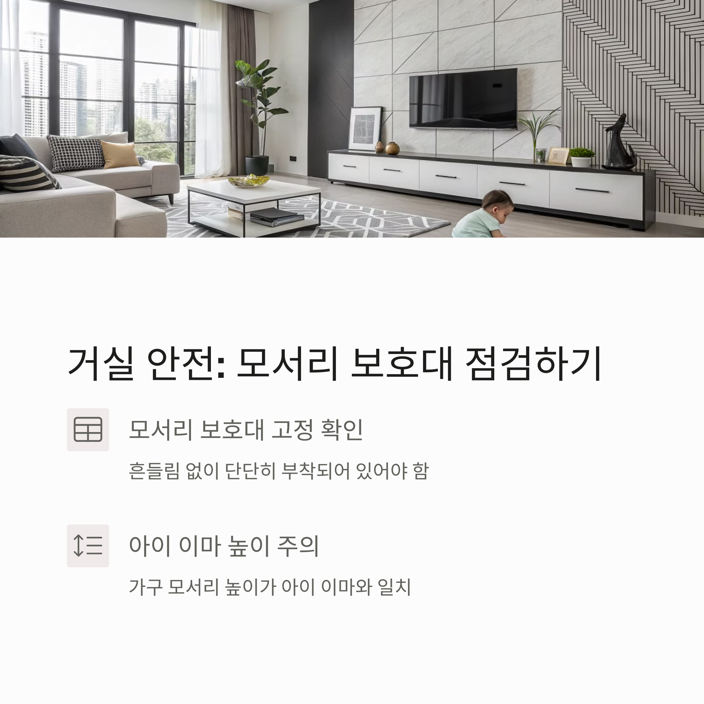 "거실 가구 중 하나라도 날카롭다면, 아기 눈높이에서 점검해보세요."