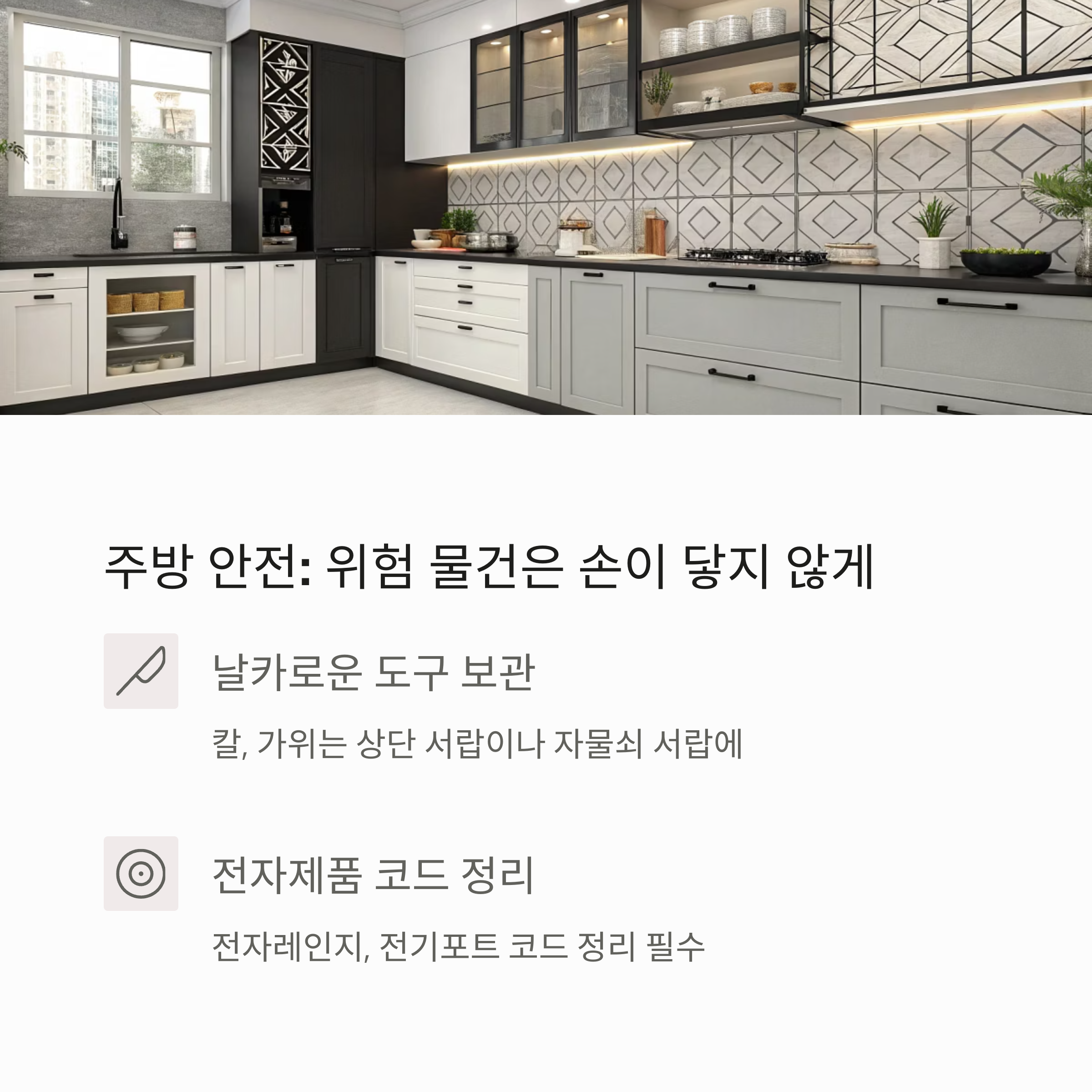 주방은 열기구, 날카로운 조리도구 등 사고 유발 요소가 집중된 공간입니다.