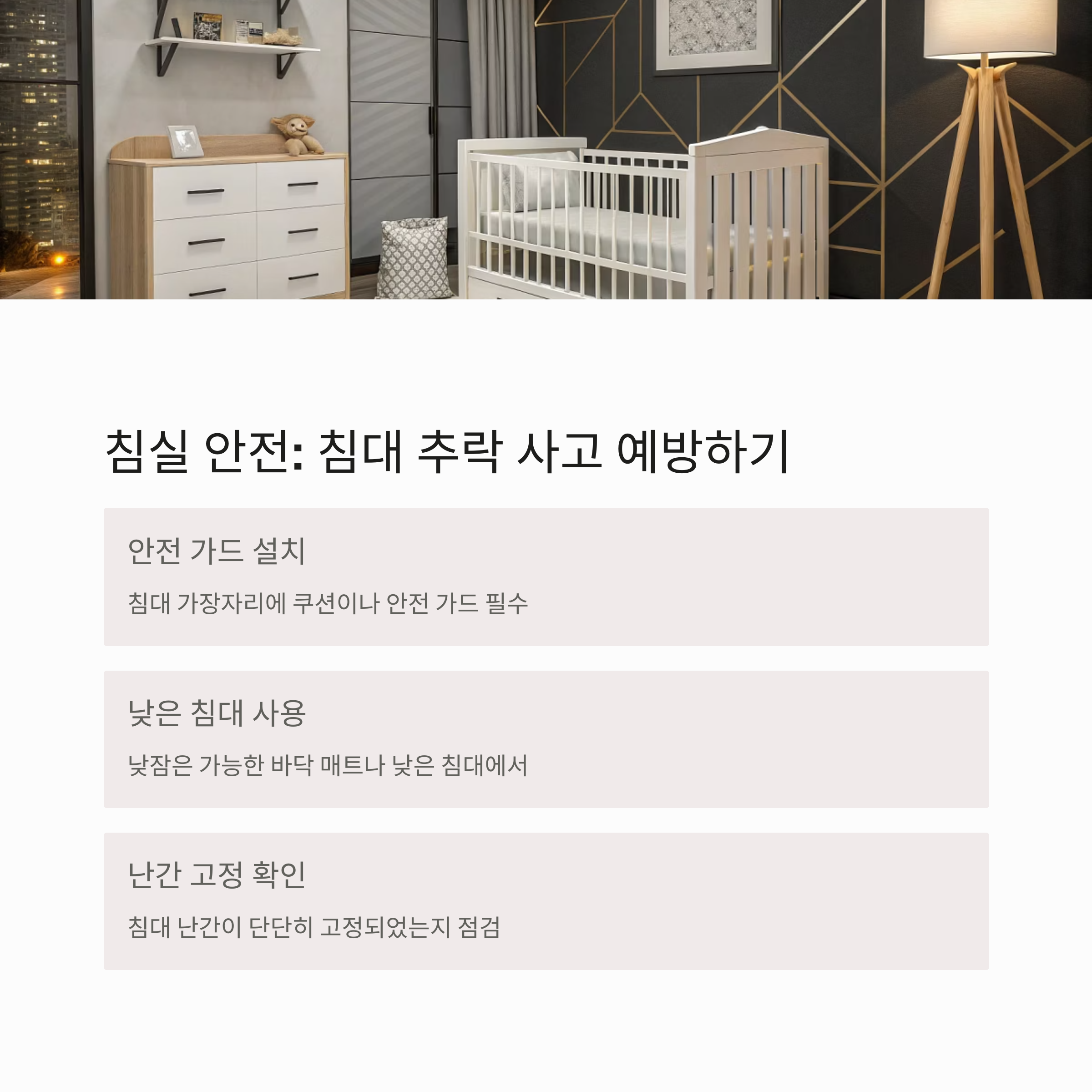 - 침대 주변에 쿠션이나 안전 가드 설치