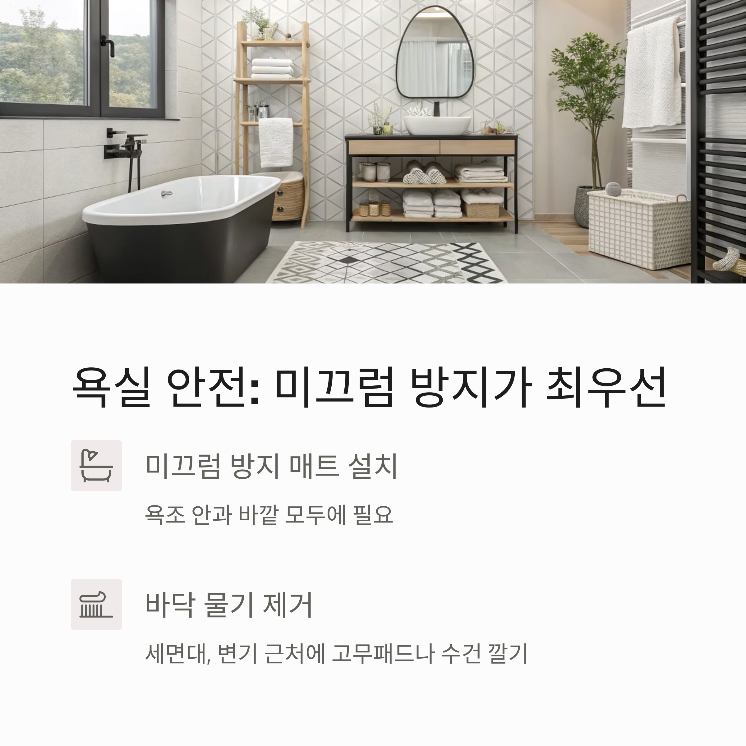 - 세면대, 변기 근처는 바닥에 수건 깔기 또는 고무패드 부착