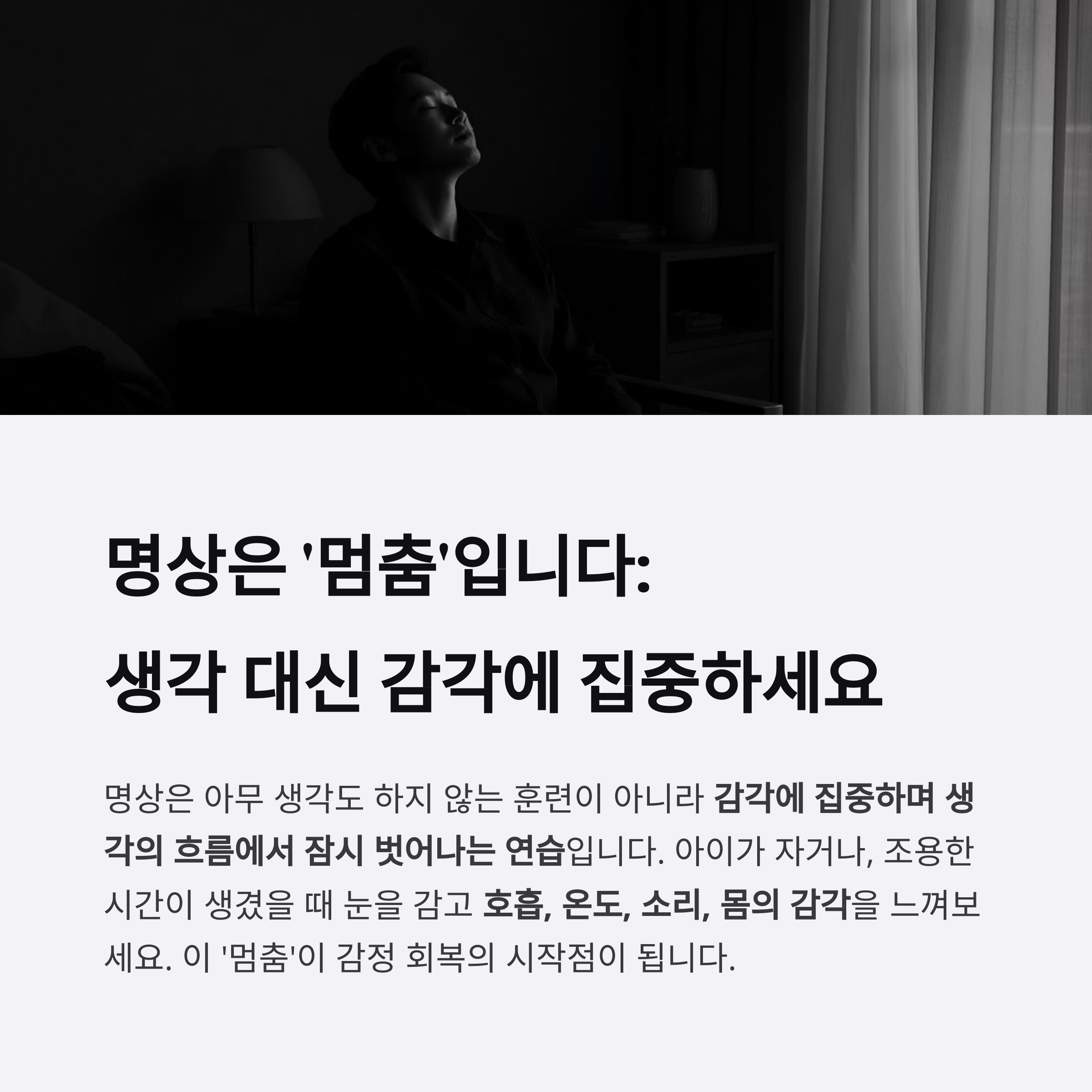 이럴 때 필요한 건 생각을 멈추고 몸과 마음을 쉬게 해주는 시간, 바로 ‘명상’입니다.