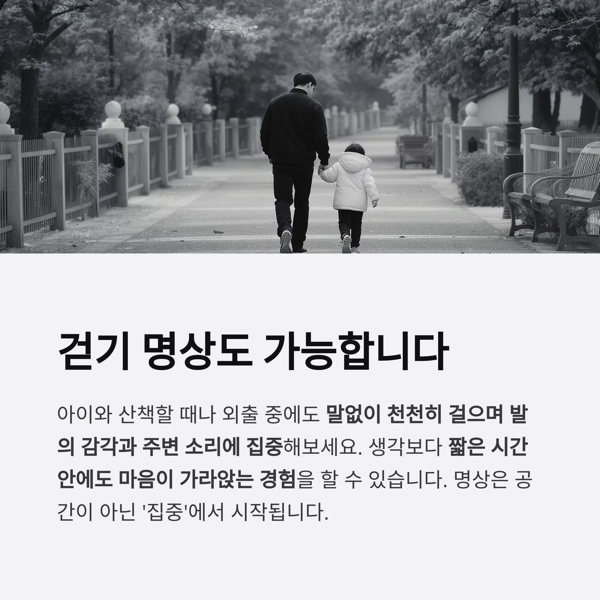말없이 천천히 걸으며 발의 감각과 주변 소리에 집중해보세요.