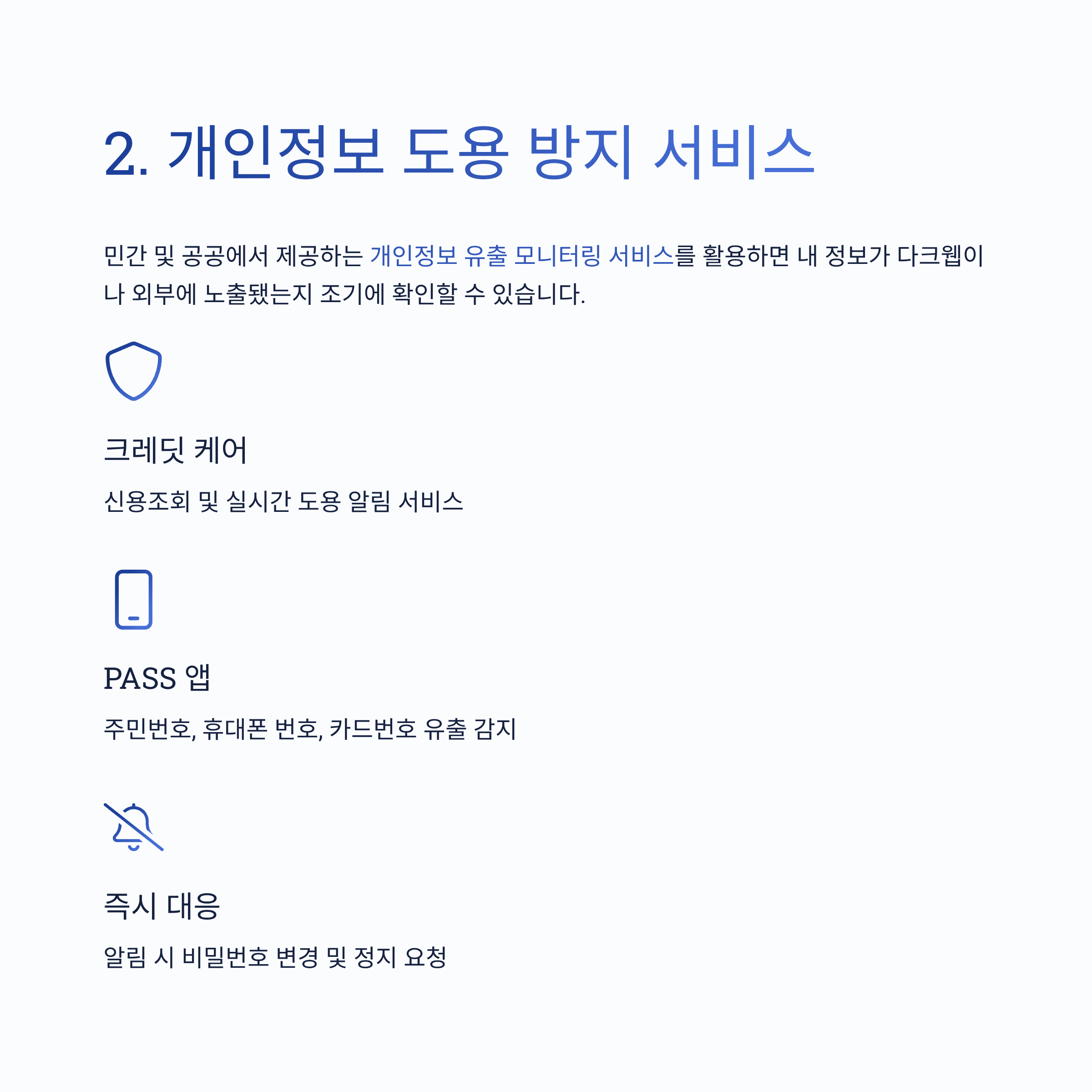 대표적인 서비스로는 크레딧 케어, 마이크레딧, PASS 앱 등을 통한 신용조회 및 실시간 도용 알림이 있으며, 주민번호, 휴대폰 번호, 카드번호 유출 여부를 자동으로 감지해 알려줍니다.