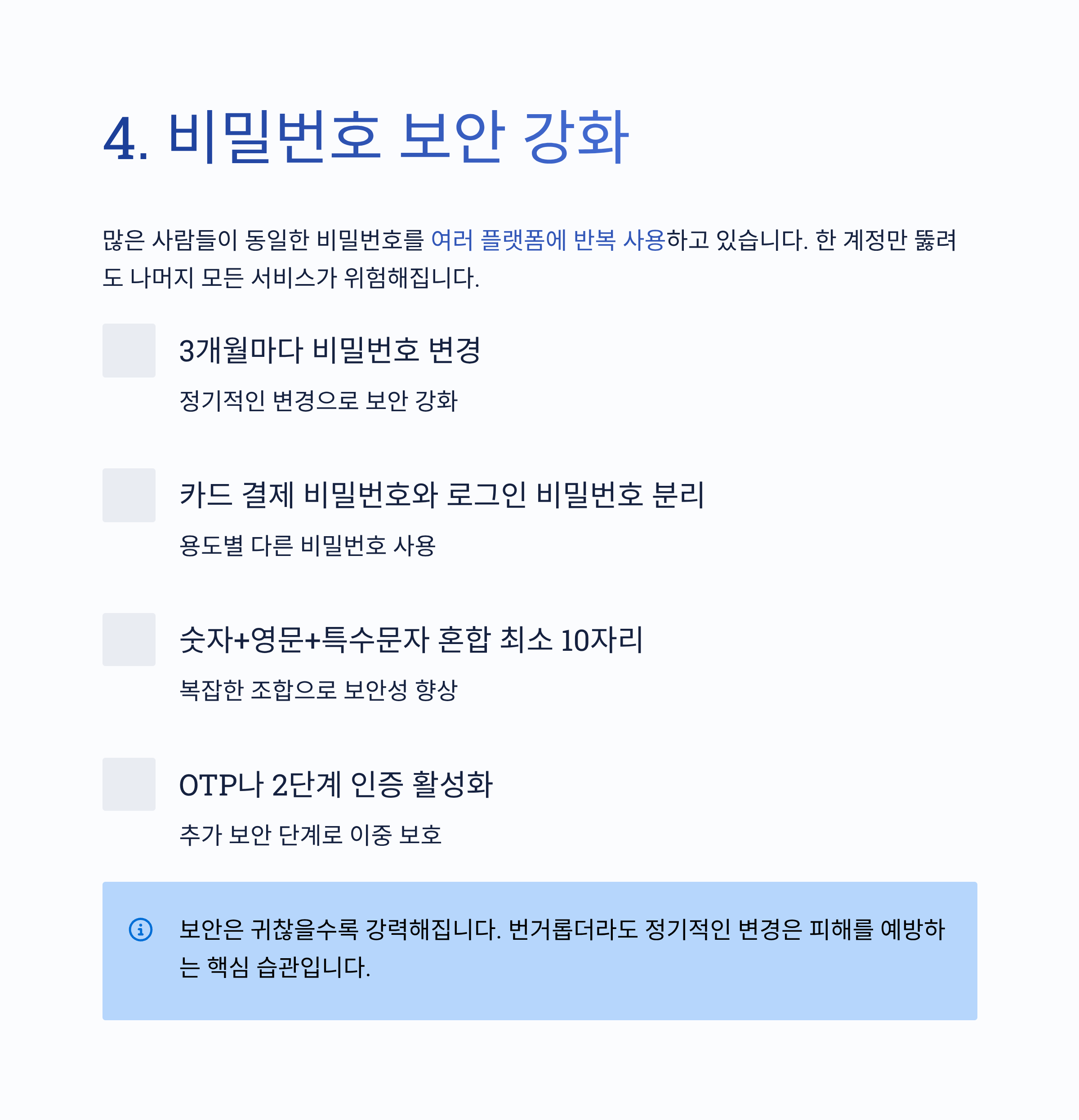 | 보안 강화 습관 | 비밀번호 주기적 변경, OTP 등록 |