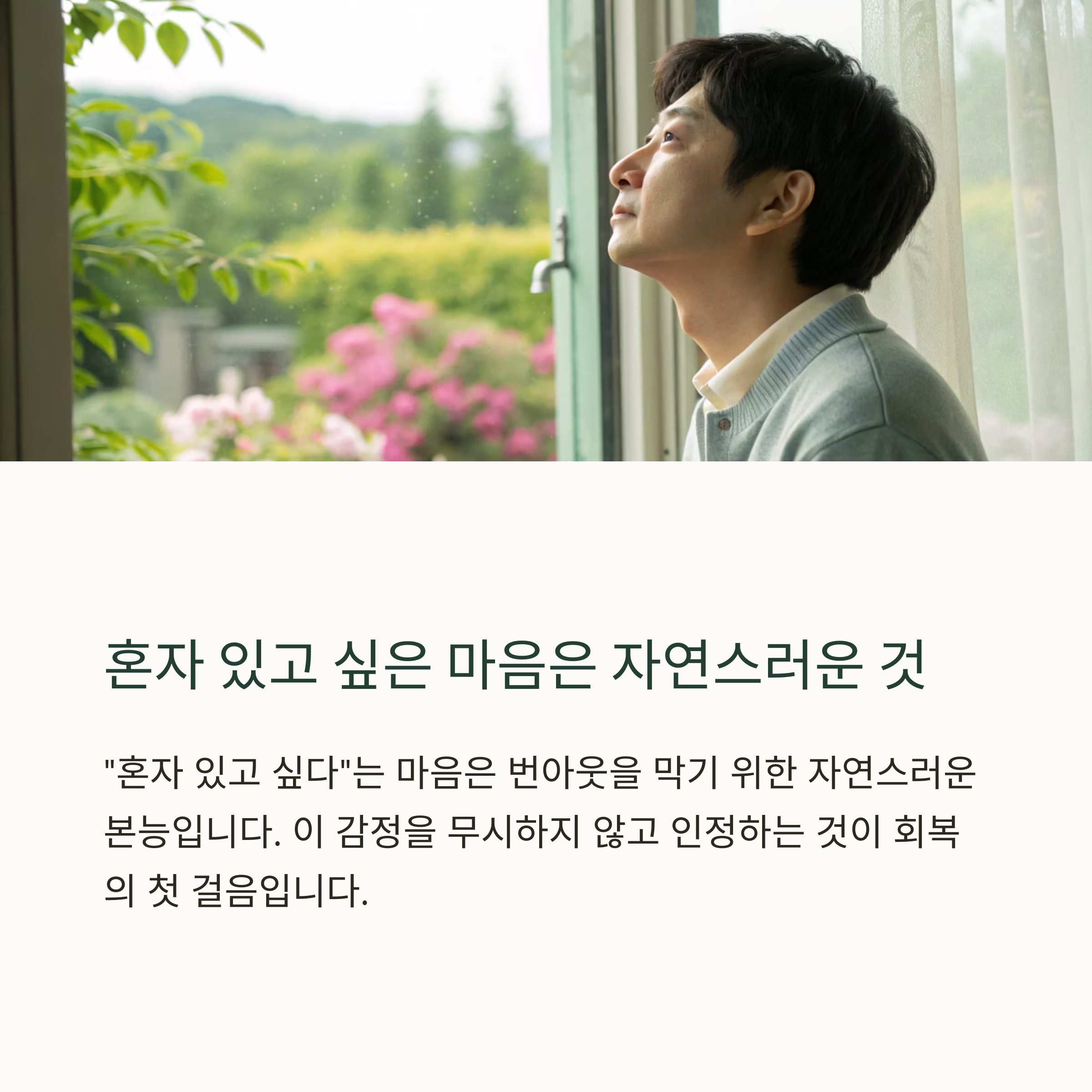 하지만 "혼자 있고 싶다"는 마음은 번아웃을 막기 위한 자연스러운 본능입니다.