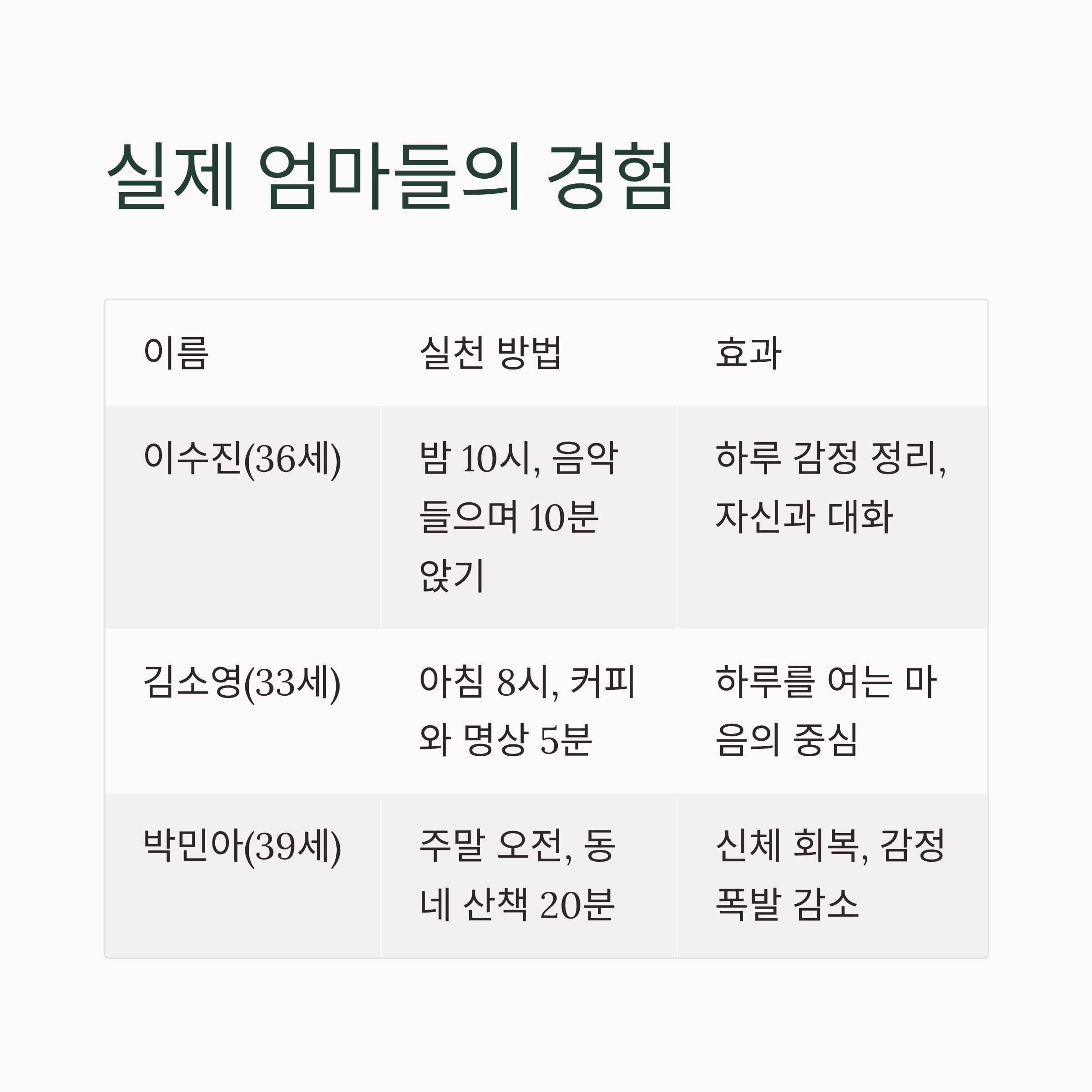 | 이수진(36세) | 밤 10시, 아이 재운 후 음악 들으며 10분 앉기 | 하루 감정 정리, 자신과 대화 가능 |