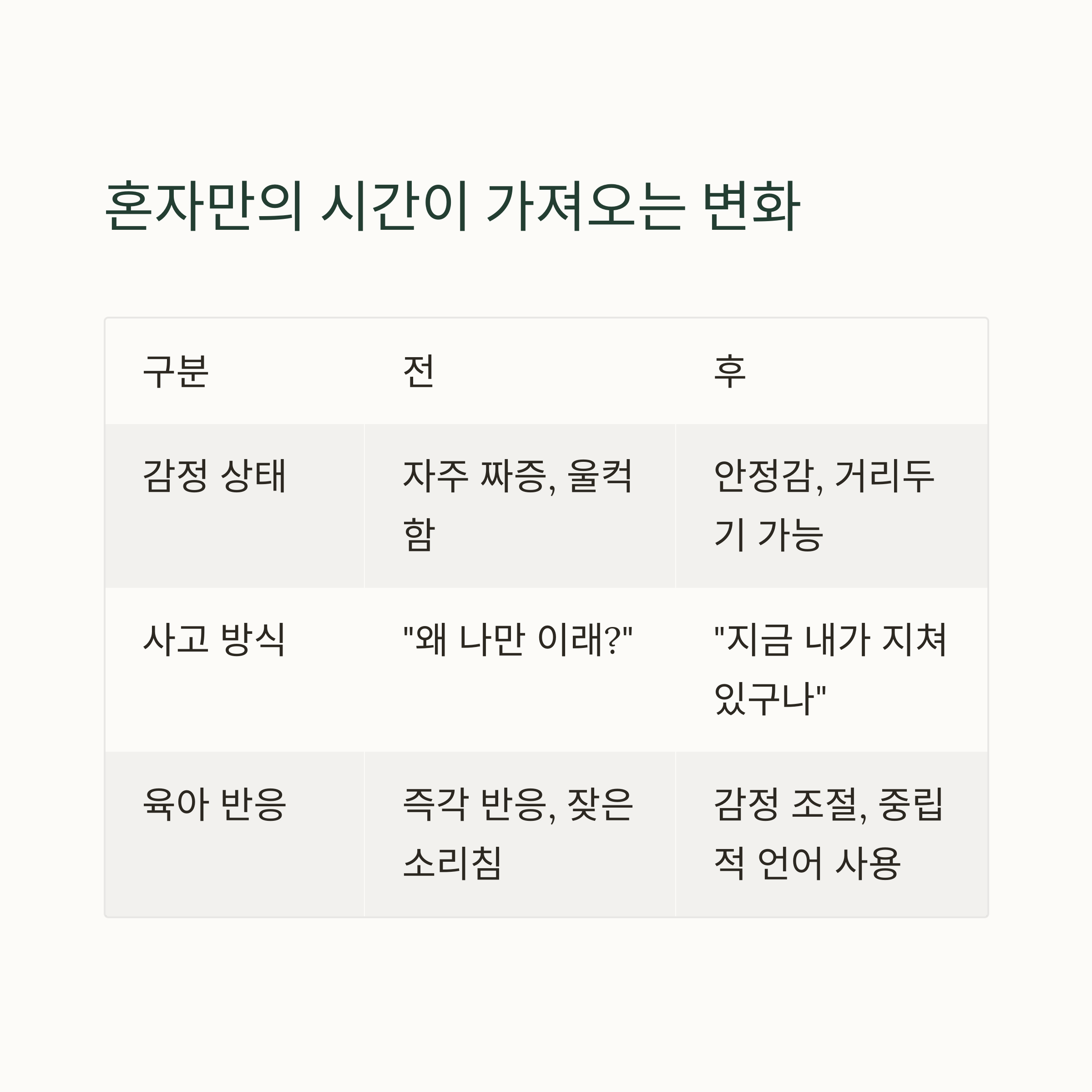 | 육아 반응 | 즉각 반응, 잦은 소리침 | 감정 조절, 중립적인 언어 사용 증가 |
