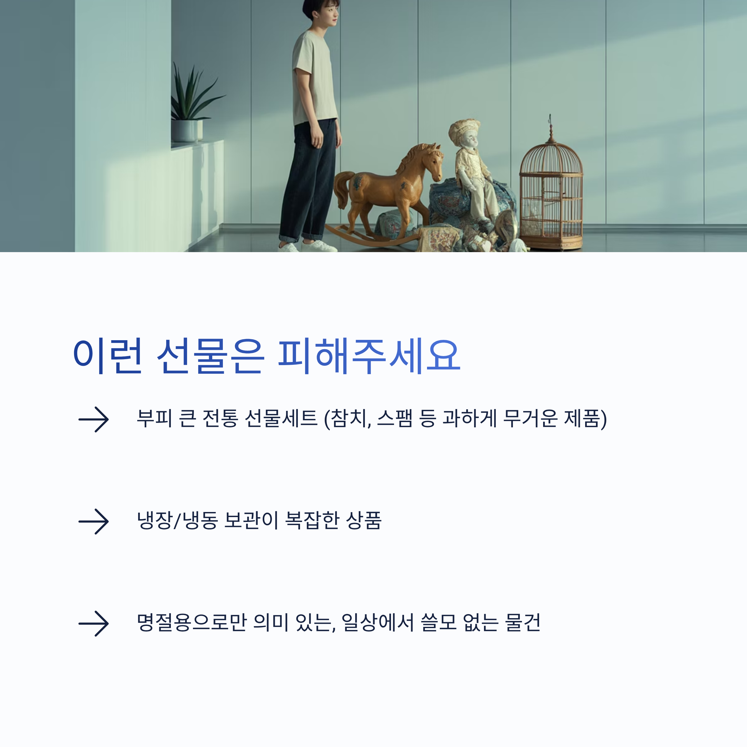 - ❌ 부피 큰 전통 선물세트 (참치, 스팸 등 과하게 무거운 제품)