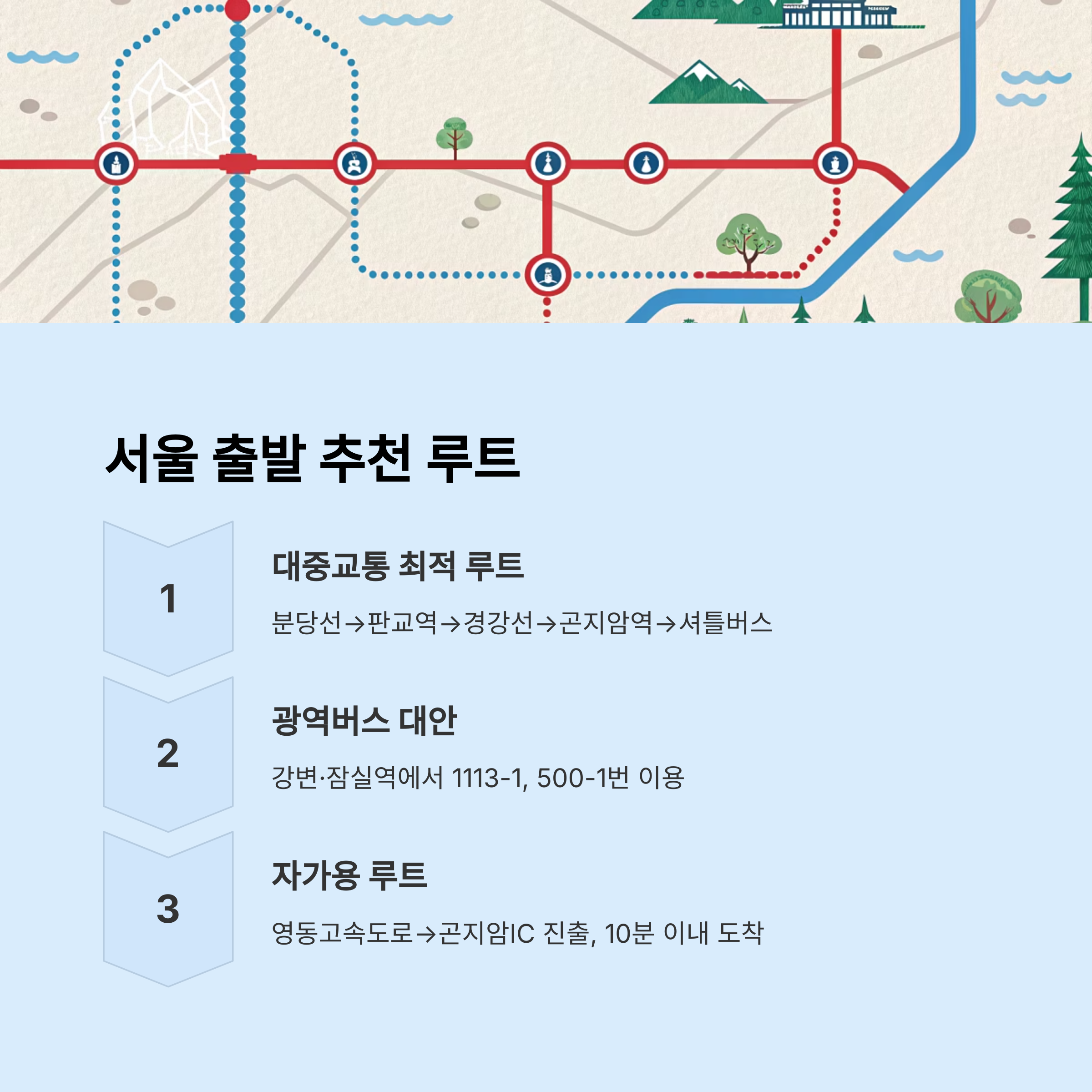 - 서초/양재: 경부고속도로 → 신갈 JC → 곤지암 IC