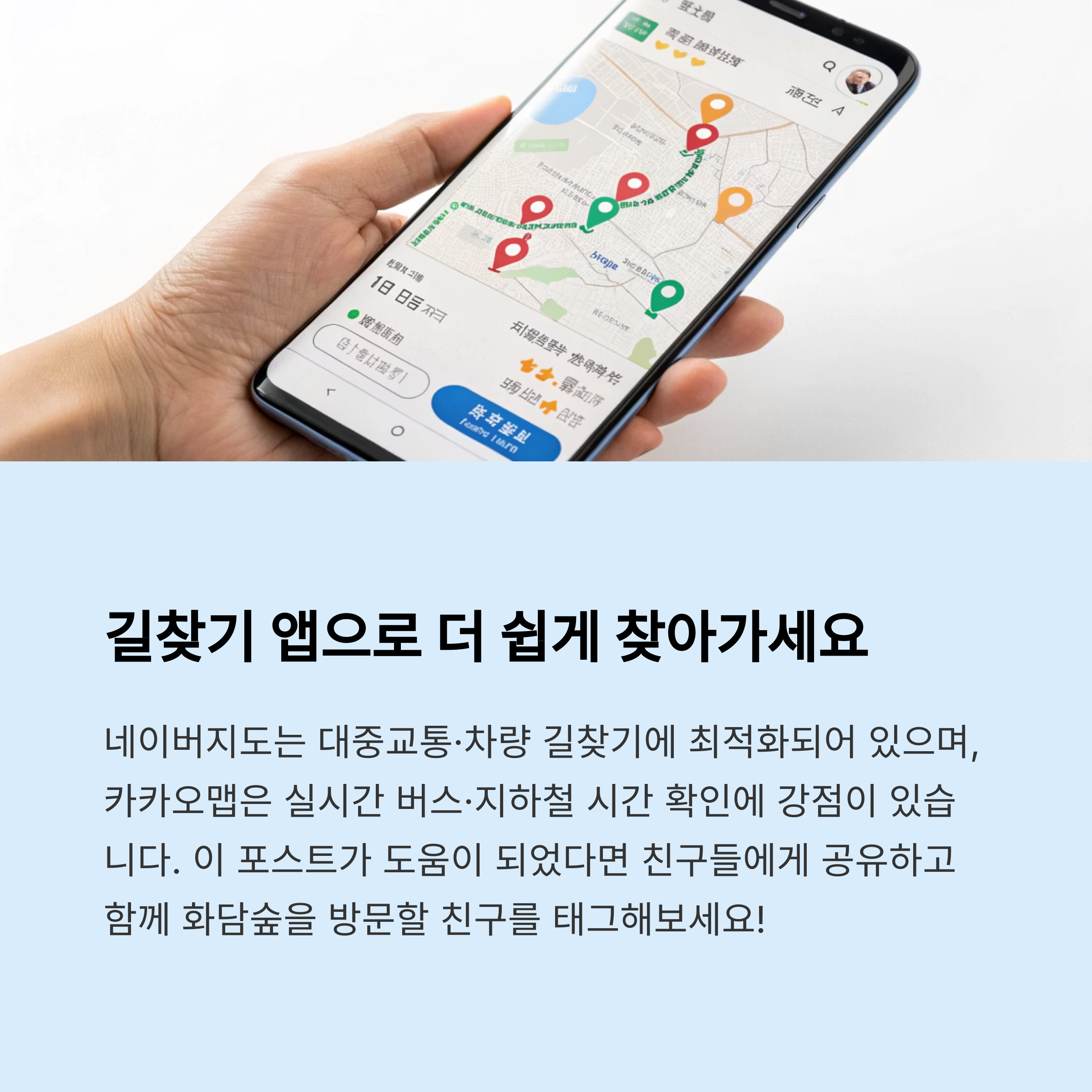 - 네이버지도: 실시간 교통 + 대중교통 경로 정확