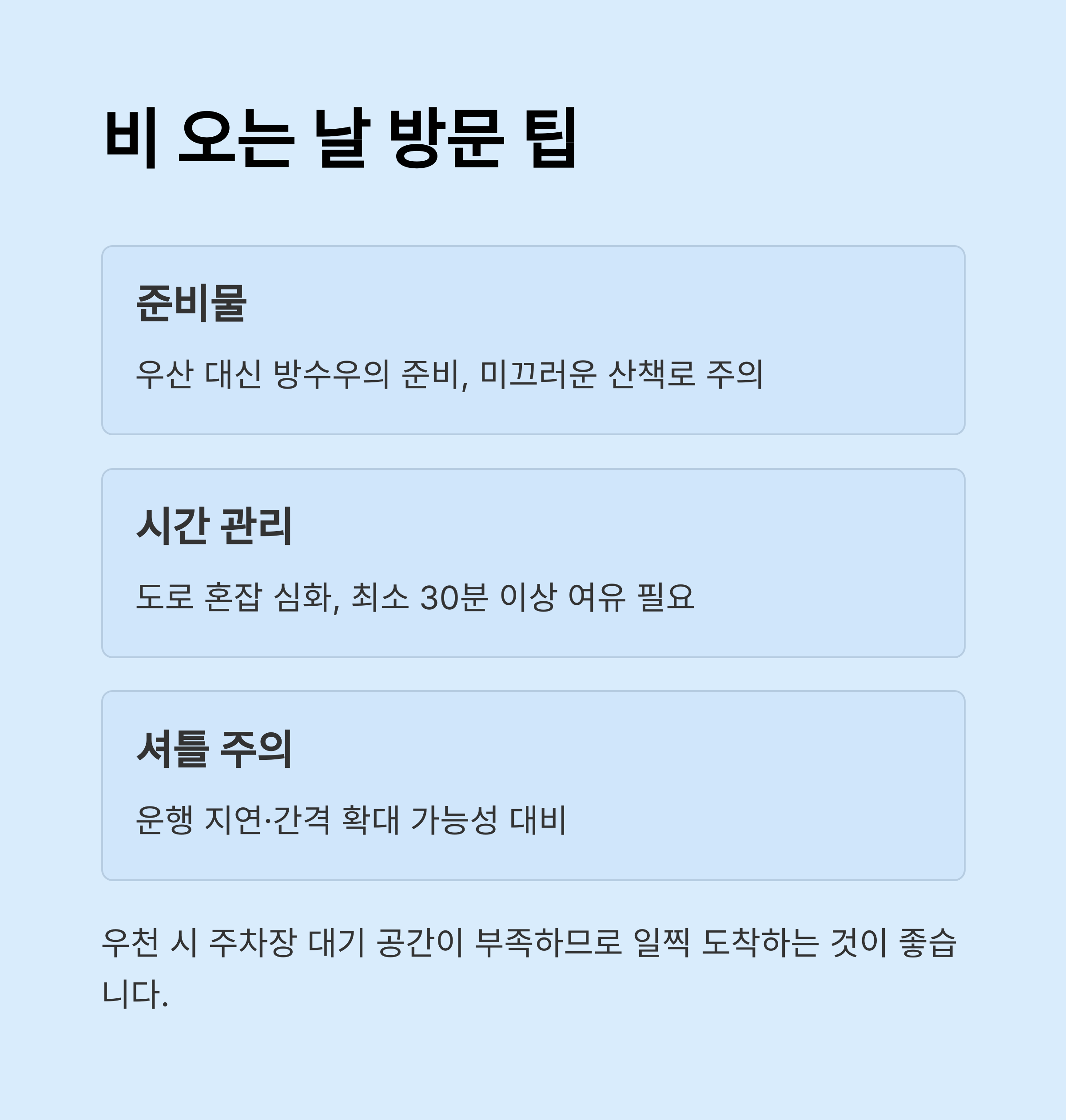 비 오는 날에는 교통 체증과 주차장 혼잡이 심해집니다