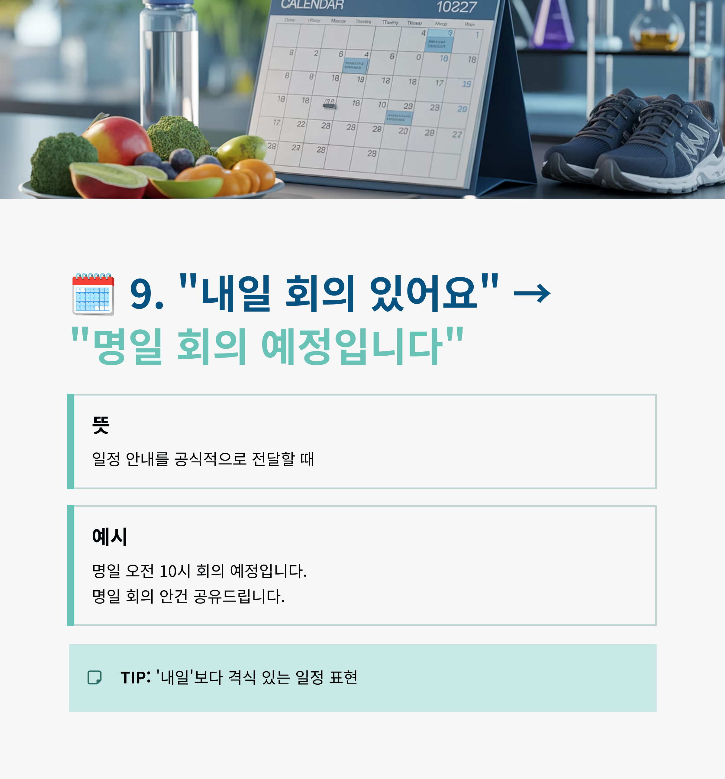 🗓 9. “내일 회의 있어요” → “명일 회의 예정입니다.”
